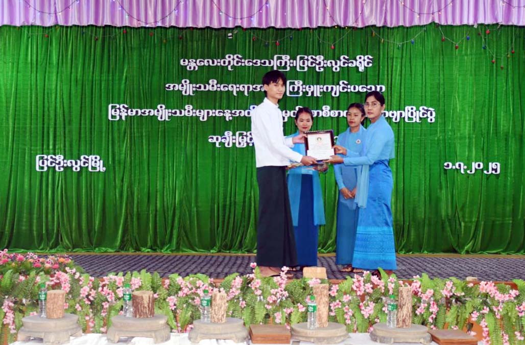 မန္တလေးတိုင်းဒေသကြီး၊ ပြင်ဦးလွင်ခရိုင်၊ ပြင်ဦးလွင်မြို့တွင် ခရိုင်အမျိုးသမီးရေးရာအဖွဲ့မှ ကြီးမှူးကျင်းပသော မြန်မာအမျိုးသမီးများနေ့ အထိမ်းအမှတ် စာစီစာကုံးနှင့် ကဗျာပြိုင်ပွဲ ဆုချီးမြှင့်ခြင်း အခမ်းအနားကို ယနေ့ နံနက် (၉) နာရီက အမှတ် (၂) အခြေခံပညာအထက်တန်းကျောင်းရှိ ကမ္ဘောဇဆောင်၌ ကျင်းပပြုလုပ်ရာ တာဝန်ရှိသူများနှင့် ကျောင်းသား၊ ကျောင်းသူများ တက်ရောက်ကြကြောင်း သိရသည်။