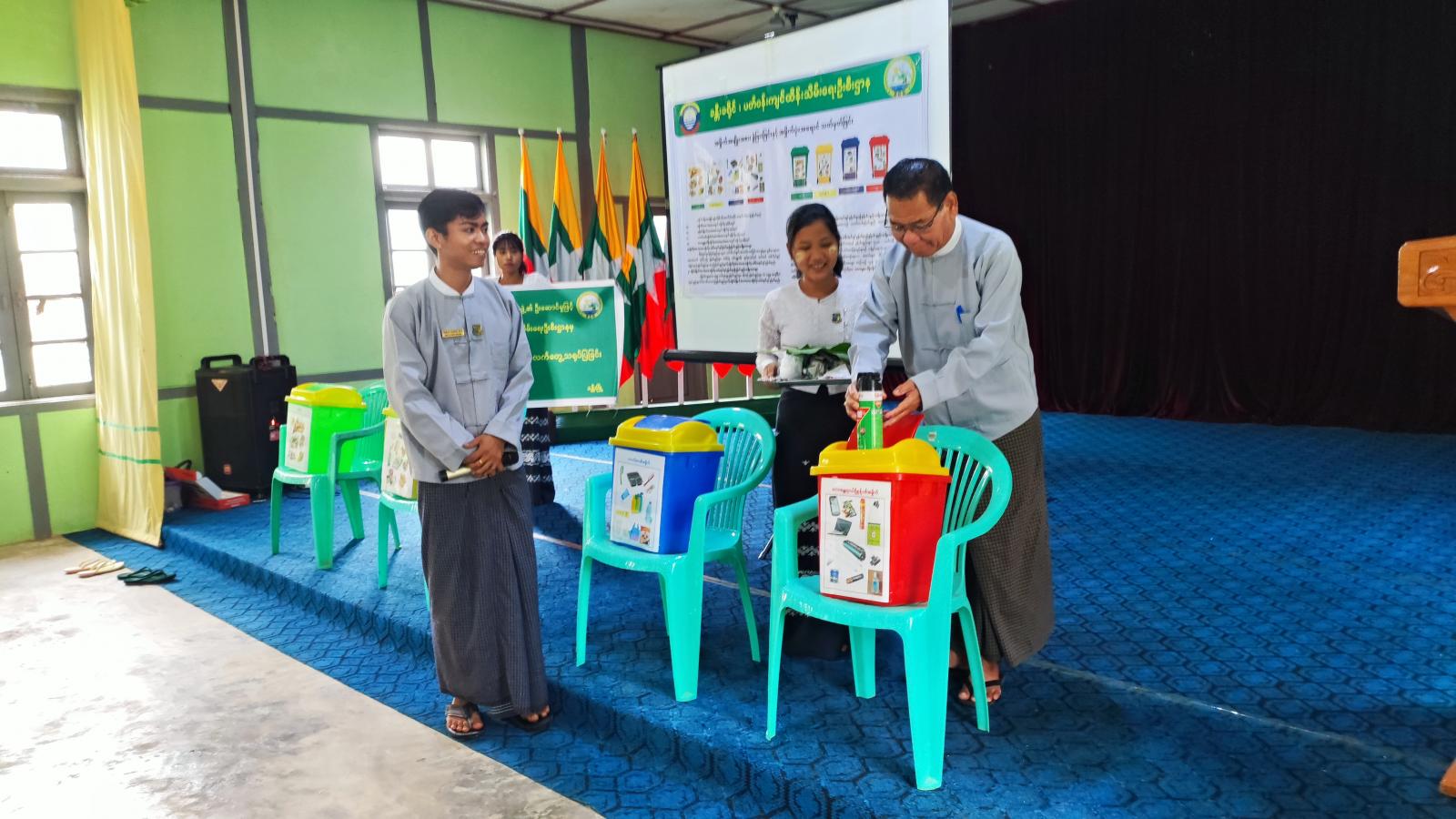 ထိုသို့ပြုလုပ်ရာတွင် ခန္တီးခရိုင်ပတ်ဝန်းကျင်ထိန်းသိမ်းရေးဦးစီးဌာန၊ ဒုတိယဦးစီးမှူး ဦးသိန်းနိုင်ထွန်းက အမှိုက်စို၊ အမှိုက်ခြောက်၊ ပလတ်စတစ်အမှိုက်၊ ဘေးအန္တရာယ်ရှိအမှိုက် ပုံးများ အရောင်ခွဲခြားသတ်မှတ်ထားမှုများနှင့် ပတ်သက်၍လည်းကောင်း၊ အမှိုက်ပုံးတွင် တပ်ထားသော အမည်များနှင့်လိုက်၍ စွန့်ပစ်ရမည့် အမှိုက်အမျိုးအစားများနှင့် ပတ်သက်၍လည်းကောင်း ရှင်းလင်းပြောကြားပြီး လက်တွေ့သရုပ်ပြသခဲ့သည်။