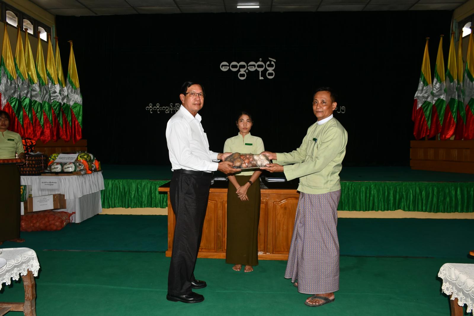 ဆက်လက်၍ တိုင်းဒေသကြီးအစိုးရအဖွဲ့ဝန်ကြီးချုပ် ဦးစိုးသိန်း၊ တိုင်းဒေသကြီးအစိုးရအဖွဲ့ဝင်များက ကြက်ဥ၊ ကြက်သွန်နီ အစရှိသည့် မီုးဖိုချောင်သုံး ရိက္ခာများ၊ အသက်ကယ်အင်္ကျီ၊ မိုးကာ၊ ဗလာစာအုပ်နှင့် စာရေးကိရိယာများ၊ အားကစားပစ္စည်းများ၊ သုတ/ရသ စာအုပ်များနှင့် ချီးမြှင့်ငွေများအား သက်ဆိုင်ရာ တာဝန်ရှိသူများထံ ပေးအပ်ခဲ့ကြပြီး တိုင်းဒေသကြီး ဝန်ကြီးချုပ်က နိဂုံးချုပ်အမှာစကားပြောကြားရာ သဘာဝဘေးအန္တရာယ် ကျရောက်လာပါက ကြိုတင်ပြင်ဆင်မှုများနှင့် အသက်ကယ်အင်္ကျီများ ထားရှိရန်၊ ရောက်ရှိလာသည့် အစားအစာများနှင့် တစ်ကိုယ်ရည်သုံး ပစ္စည်းများအား စနစ်တကျဖြန့်ဝေပေးသွားရန်နှင့် လိုအပ်သည်များ ဖြည့်ဆည်းဆောင်ရွက်ပေးသွားမည်ဖြစ်ကြောင်း စသည်တို့ကို မှာကြားသည်။
