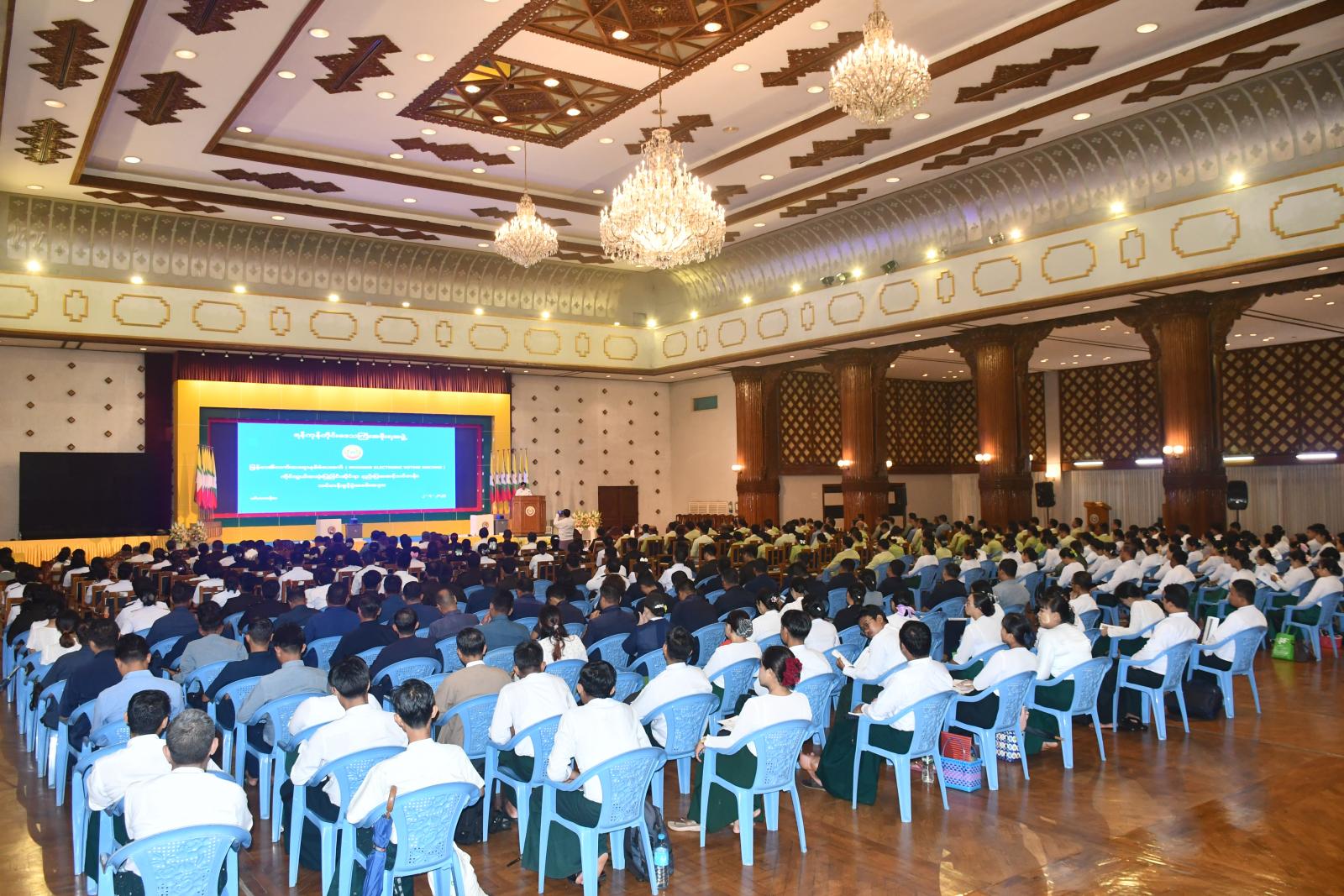 မြန်မာအီလက်ထရောနစ်မဲပေးစက် (MYANMAR ELECTRONIC VOTIN MACHINE) ကိုင်တွယ်အသုံးပြုခြင်းဆိုင်ရာ နည်းပြအဆင့် သင်တန်းဖွင့်ပွဲအခမ်းအနားကို ယမန်နေ့နံနက်ပိုင်းက ရန်ကုန်တိုင်းဒေသကြီးအစိုးရအဖွဲ့ရုံး၊ မင်္ဂလာခန်းမတွင် ကျင်းပသည်။
