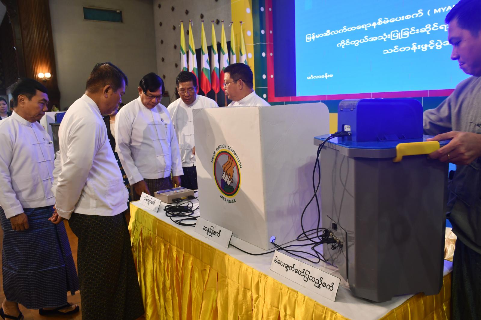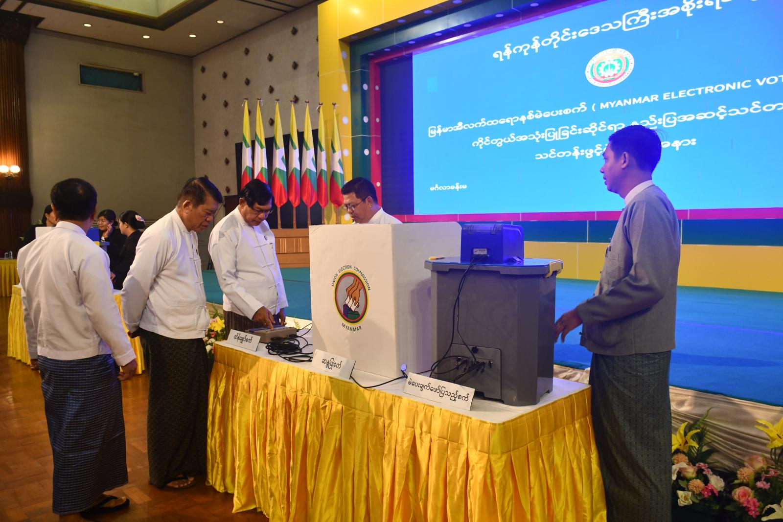 ယင်းနောက် ပြည်ထောင်စုရွေးကောက်ပွဲကော်မရှင်မှ တာဝန်ရှိသူများက မြန်မာအီလက်ထရောနစ်မဲပေးစက် (MYANMAR ELECTRONIC VOTIN MACHINE) ဖြင့် မဲပေးနည်းအား သရုပ်ပြသခဲ့ပြီး ရန်ကုန်တိုင်းဒေသကြီးအစိုးရအဖွဲ့ ဝန်ကြီးချုပ် ဦးစိုးသိန်းနှင့် တာဝန်ရှိသူများက လက်တွေ့စမ်းသပ်ခဲ့ကြောင်းနှင့် သင်ခန်းစာပို့ချခြင်းများအား ဆက်လက်ဆောင်ရွက်ခဲ့ကြကြောင်း သိရသည်။