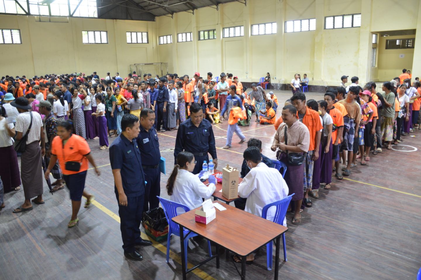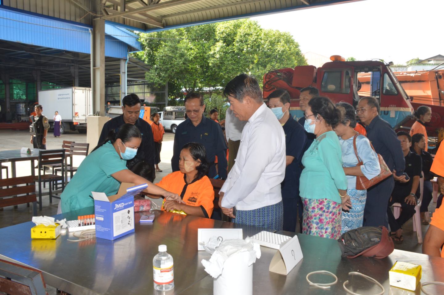 ရန်ကုန်မြို့တော်စည်ပင်သာယာရေးကော်မတီ၊ ပြည်သူ့ကျန်းမာရေးဌာနနှင့် ရန်ကုန်အနောက်ပိုင်းဆေးရုံကြီးတို့ပူးပေါင်း၍ မြို့ပြပတ်ဝန်းကျင်ထိန်းသိမ်းရေးနှင့် သန့်ရှင်းရေးဌာနမှဝန်ထမ်းများအား အသည်းရောင်အသားဝါ ဘီပိုး ရှိ/မရှိ စစ်ဆေးပေးခြင်းအား ယမန်နေ့နံနက်ပိုင်းက အလုံမြို့နယ်၊ မြို့ပြပတ်ဝန်းကျင်ထိန်းသိမ်းရေးနှင့် သန့်ရှင်းရေးဌာန၊ မော်တော်ယာဉ်ဝင်း၌ ဆောင်ရွက်ပေးခဲ့ရာ ရန်ကုန်မြို့တော်စည်ပင်သာယာရေးကော်မတီဥက္ကဋ္ဌ (မြို့တော်ဝန်) ဦးဗိုလ်ဌေး သွားရောက်ကြည့်ရှုအားပေးသည်။