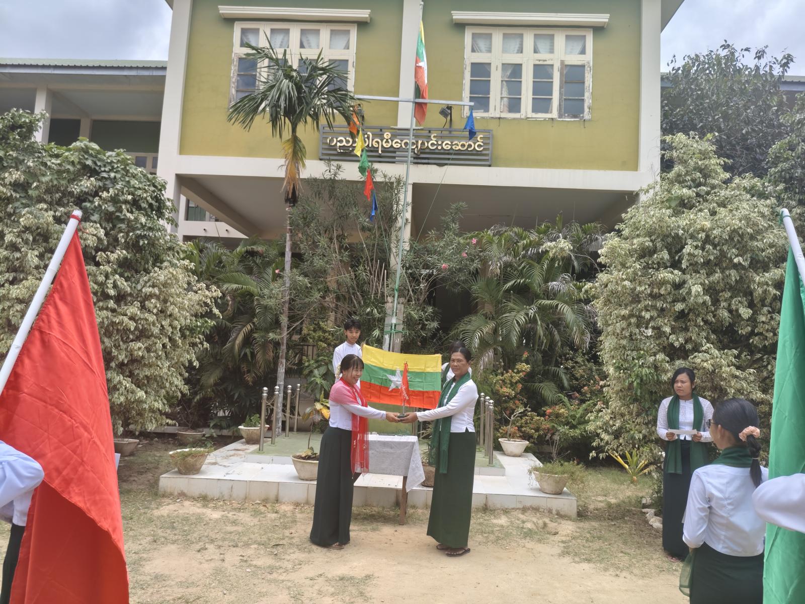 အခမ်းအနားတွင် ဆရာ၊ ဆရာမများ၊ ကျောင်းသား၊ ကျောင်းသူများက ကျောင်းကောင်စီသီချင်းကို သံပြိုင်သီဆိုပြီးနောက် ကျောင်းအုပ်ဆရာမကြီး ဒေါ်ရီရီချိုက ကျောင်းကောင်စီ ဖွဲ့စည်းတာဝန်ပေးအပ်ရခြင်း၏ ရည်ရွယ်ချက်၊ ခံယူသည့်မူဝါဒ၊ ကတိသစ္စာ (၄) ချက်၊ အသင်းအမည်များနှင့် ကိုယ်စားပြု အလံအရောင်များစသည့် လုပ်ငန်းစဉ်များကို ရှင်းလင်းပြောကြားသည်။ ဆက်လက်၍ ကျောင်းကောင်စီအဖွဲ့၏ အမည်စာရင်းများ ကြေညာကာ ကျောင်းအုအ်ဆရာမကြီးက တာဝန်ပေးအထိမ်းအမှတ်အလံများအား အသင်းတာဝန်ခံဆရာ၊ ဆရာမများနှင့် ကျောင်းသား၊ ကျောင်းသူများထံ ပေးအပ်သည် ။
