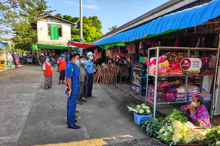 ထိုသို့ စစ်ဆေးရာတွင် မြို့နယ် စည်ပင်သာယာရေးအဖွဲ့ တာဝန်ရှိသူများ၊ မြို့မဈေး ကော်မတီအဖွဲ့များ ဦးဆောင်၍ ဈေးရောင်းသူများတွင် Mask နှင့် Face Shield တပ်ဆင်ခြင်း ရှိ/မရှိကို လိုက်လံစစ်ဆေးကြပြီး၊ မတပ်ဆင်ပါက ဒဏ်ကြေးသတ်မှတ် ဆောင်ရွက်လျက်ရှိကြောင်း၊ ဈေးဝယ်သူများအားလုံးလည်း Mask တပ်ဆင်ပြီးမှ ဈေးအတွင်း ဝင်ရောက် ရမည်ဖြစ်ကြောင်း သိရသည်။