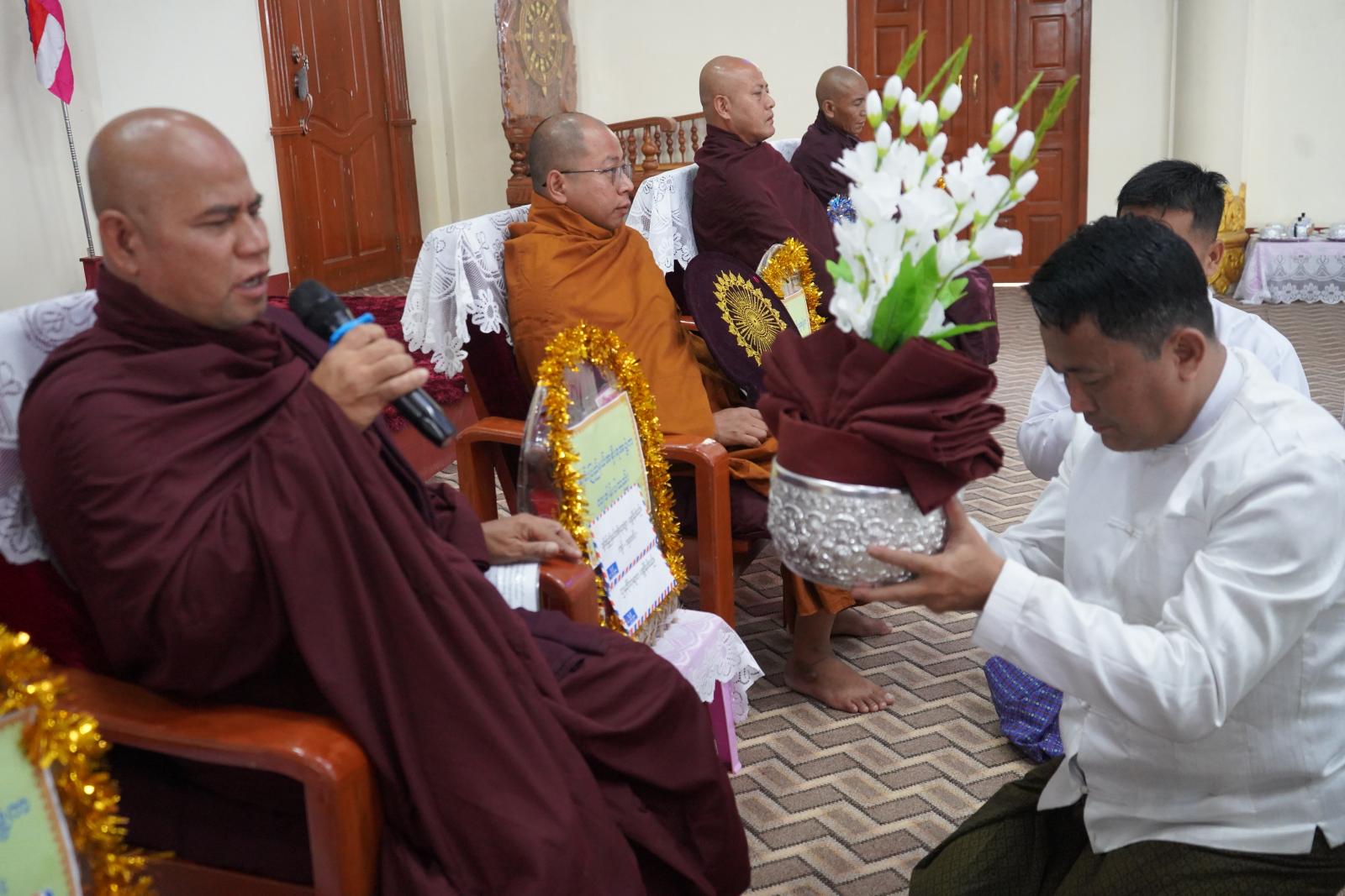 ယင်းနောက် ဟားခါး၊ ထန်တလန်မြို့နယ် သံဃနာယကအဖွဲ့ဥက္ကဋ္ဌ၊ ဟားခါးမြို့၊ ကျောဘုတ် သာသနာပြုကျောင်းတိုက်၏ ဦးစီးပဓာန နာယက အဂ္ဂမဟာသဒ္ဒမ္မဇောတိကဓဇ ဆရာတော် ဘဒ္ဒန္တပညောဘာသ အရှင်သူမြတ်ထံမှ ကုသိုလ်ကောင်းမှုအစုစုတို့အတွက် အနုမောဒနာတရားနာကြား၍ ရေစက်သွန်းချ အမျှပေးဝေကာ “ ဗုဒ္ဓသာသနံ စိရံ တိဋ္ဌတု ” သုံးကြိမ်ရွတ်ဆို ဆုတောင်း၍ အခမ်းအနားရုပ်သိမ်းပြီး ရတနာရွှေမိုး ငွေမိုးရွာသွန်းဖြိုးကာ သံဃာတော်များနှင့် သီလရှင်ဆရာကြီးများအား နေ့ဆွမ်းဆက်ကပ်လှူဒါန်းခဲ့ကြောင်း သိရသည်။