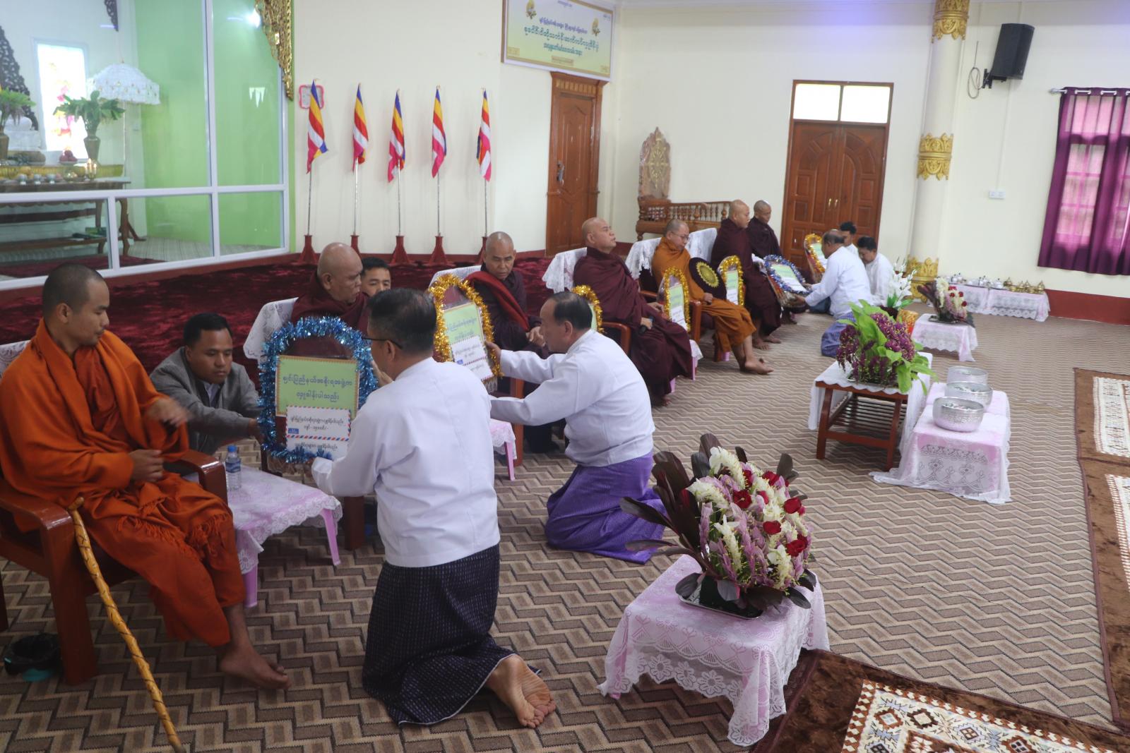 ထို့နောက် သံဃာတော်များနှင့် သီလရှင်ဆရာကြီးများဖြစ်ကြသည့် လုံခြုံရေးနှင့် နယ်စပ်ရေးရာဝန်ကြီး ဗိုလ်မှူးကြီး သိန်းထွန်းအောင်၊ ပြည်နယ်တရားလွှတ်တော်တရားသူကြီးချုပ် ဦးနေစိုး၊ အနောက်မြောက်တိုင်းစစ်ဌာနချုပ် ဒုတိယတိုင်းမှူး ဗိုလ်မှူးချုပ် မိုးဟိန်း၊ သယံဇာတရေးရာဝန်ကြီး ဦးကျော်ငြိမ်း၊ လမ်းပန်းဆက်သွယ်ရေးဝန်ကြီး ဦးနေလင်းအောင်၊ တိုင်းရင်းသားရေးရာဝန်ကြီး ဦးစိန်ထွန်းလှ စစ်ဗျူဟာ ( အခြေချဟားခါး ) မှ စစ်ဗျူဟာမှူးနှင့် ပြည်နယ်၊ ခရိုင်၊ မြို့နယ်အဆင့် ဌာနဆိုင်ရာတာဝန်ရှိသူများနှင့် စေတနာရှင်များက ဝါဆိုသင်္ကန်းနှင့် လှူဖွယ်ဝတ္ထုပစ္စည်းများ ဆက်ကပ်လှူဒါန်းကြသည်။