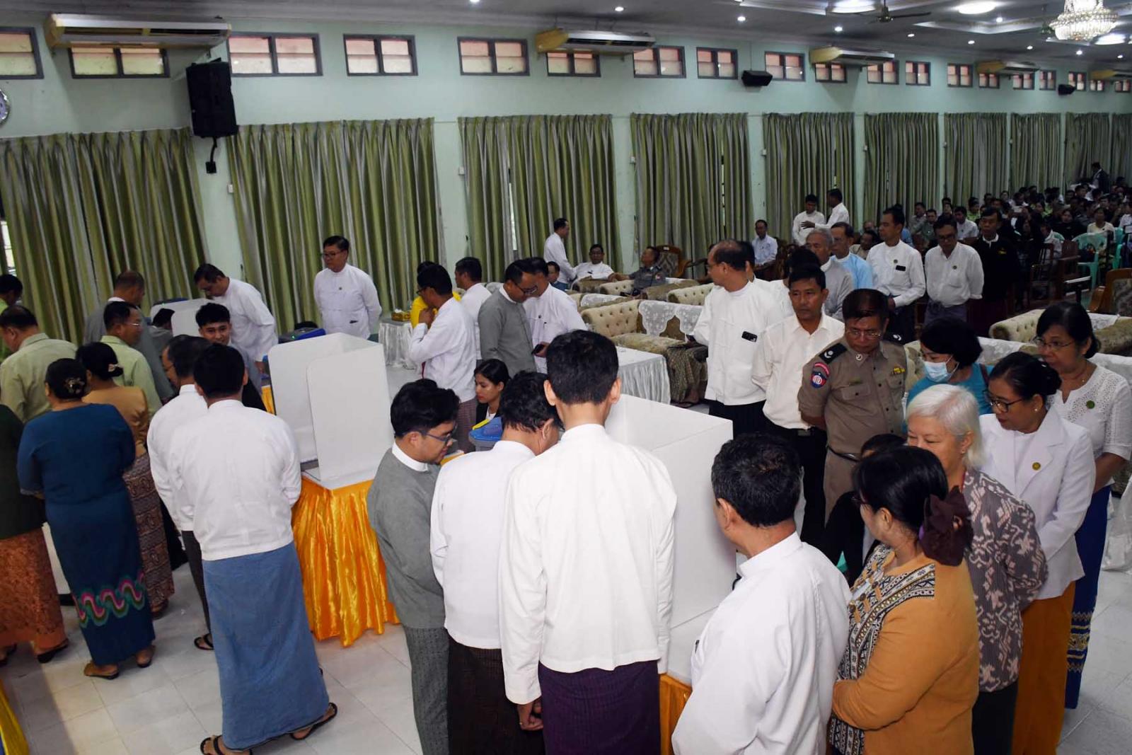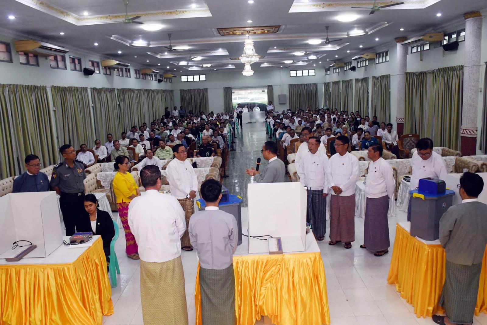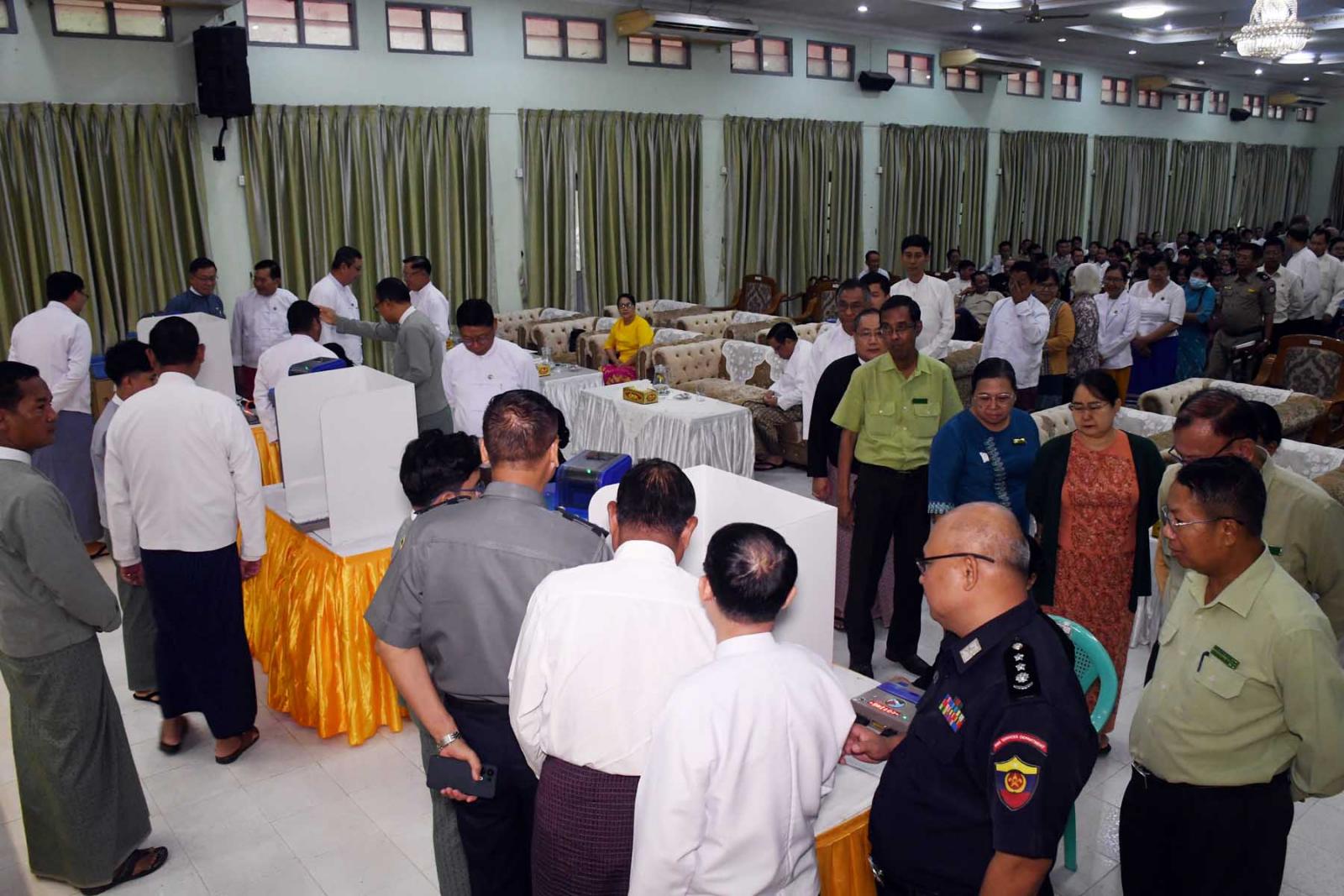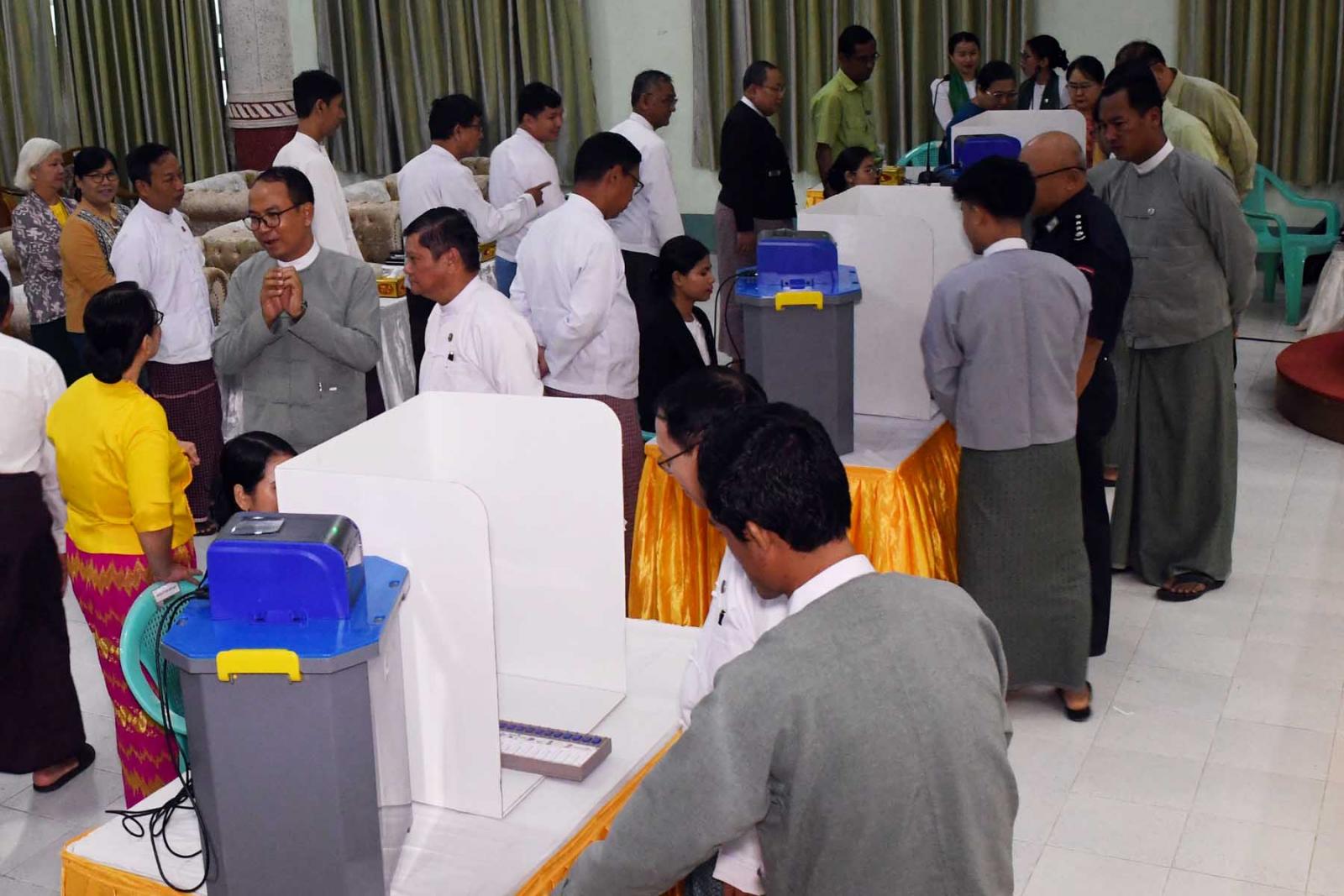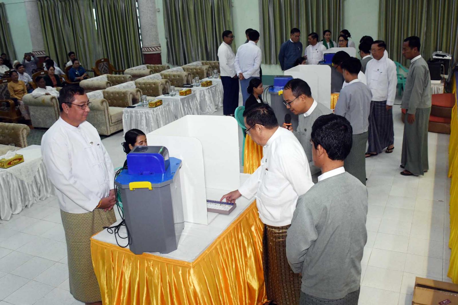 ဆက်လက်၍ တိုင်းဒေသကြီးဝန်ကြီးချုပ်၊ တိုင်းဒေသကြီးတရားလွှတ်တော်တရားသူကြီချုပ်၊ တိုင်းဒေသကြီးဝန်ကြီးများနှင့် ဌာနဆိုင်ရာတာဝန်ရှိသူများက အီလက်ထရောနစ်မဲပေးစက်အသုံးပြု၍ လက်တွေ့စမ်းသပ်သရုပ်ပြမဲပေးသည်။