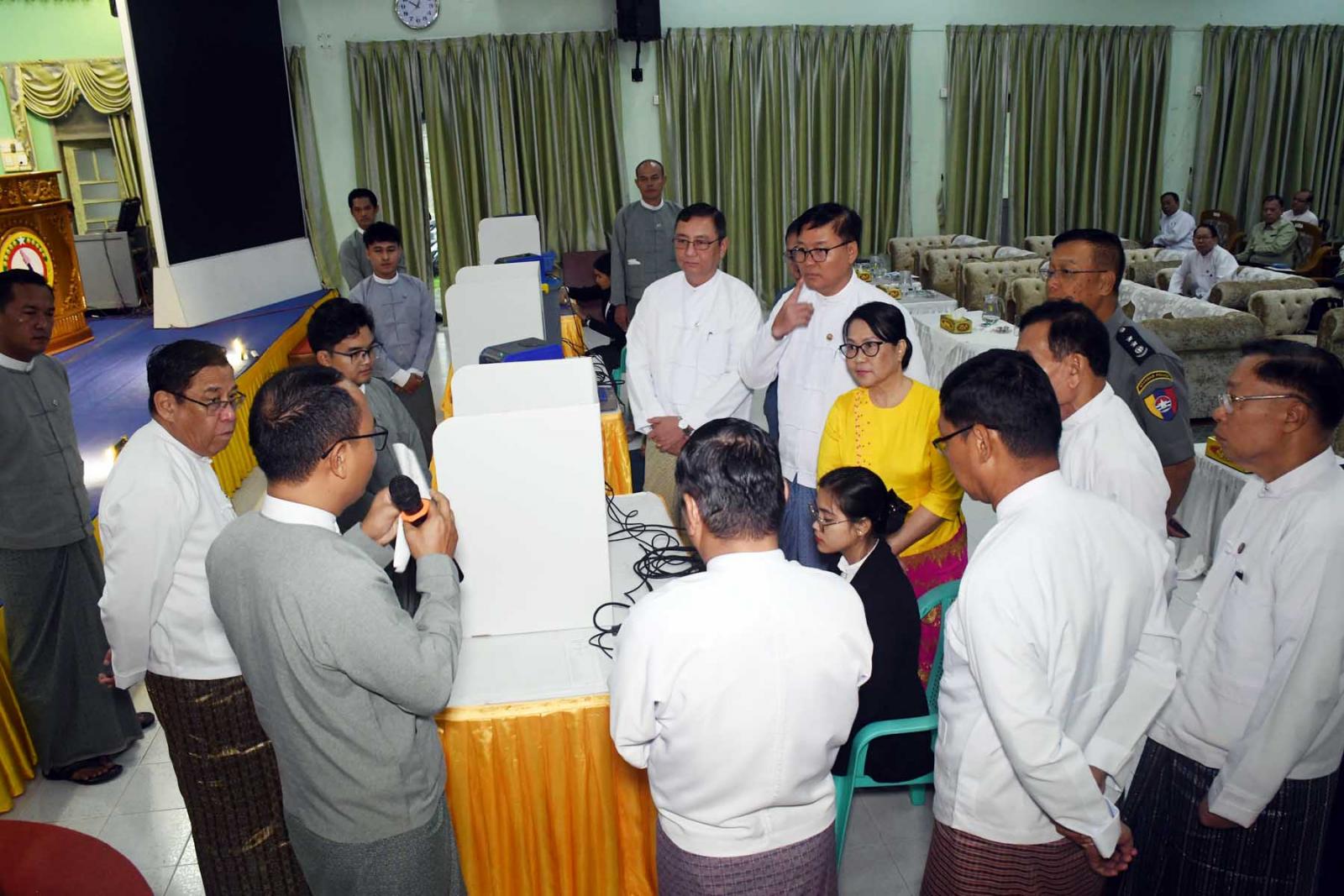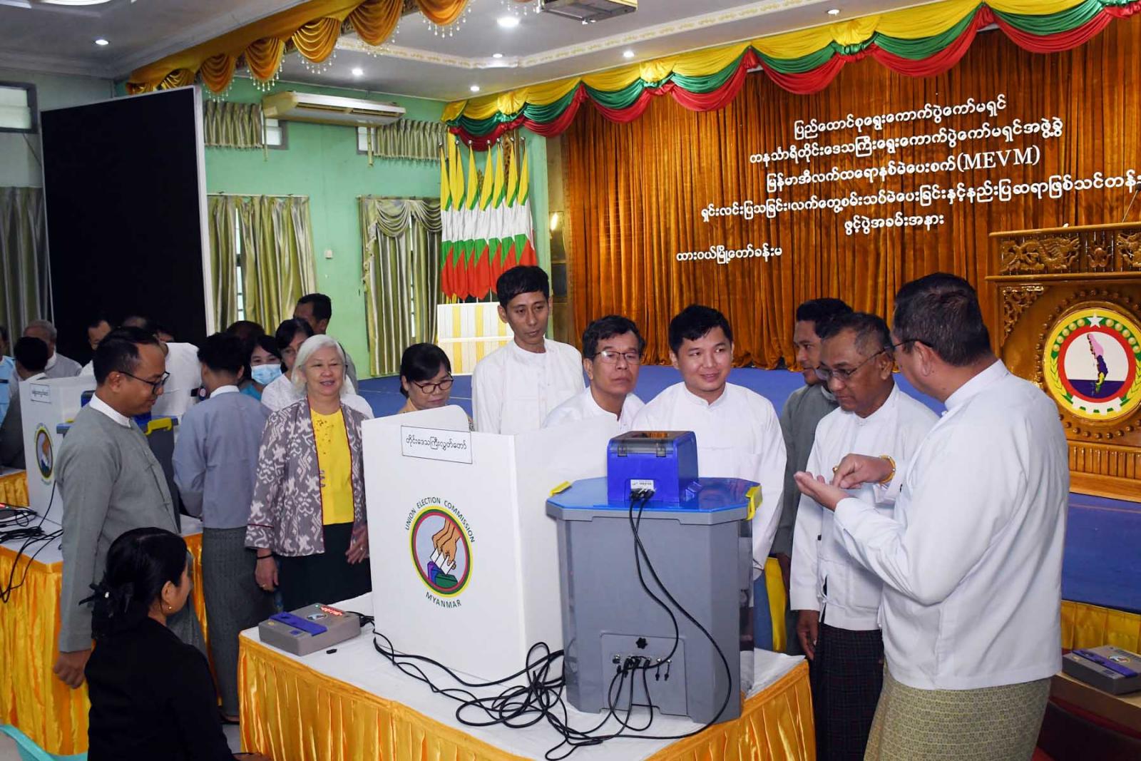 ထို့နောက် ပြည်ထောင်စုရွေးကောက်ပွဲကော်မရှင်အဖွဲ့ဝင် (တနင်္သာရီတိုင်းဒေသကြီးတာဝန်ခံ) ဦးကိုကိုလွင်က မဲပေးစက် တည်ဆောက်ပုံ နည်းလမ်းများ၊ စက်တပ်ဆင်ပုံ၊ စမ်းသပ်မဲပေးပုံ၊ ဖြန့်ခွဲပုံ၊ ရွေးကောက်ပွဲနေ့တွင်မဲရုံ၌ မဲပေးစက်တပ်ဆင်ခင်းကျင်းပုံ၊ မဲရလဒ်ရေတွက်ပုံ၊ နည်းဥပဒေပါအတိုင်း မဲရလဒ်စာရင်းပြုစုပုံ၊ မဲပေးစက်အားပြန်လည်ထုပ်ပိုး သိမ်းဆည်းပုံတို့ကို စနစ်တကျသင်ကြားပြသပေးမည်ဖြစ်ကြောင်း ရှင်းလင်းပြောကြားပြီး ပြည်ထောင်စုရွေးကောက်ပွဲကော်မရှင်ရုံးမှ ဒုတိယညွှန်ကြားရေးမှူးချုပ် ဦးညီညီလွင်က MEVM စက်အသုံး ပြုရခြင်းနှင့်စပ်လျဉ်း၍ ရှင်းလင်းတင်ပြသည်။
