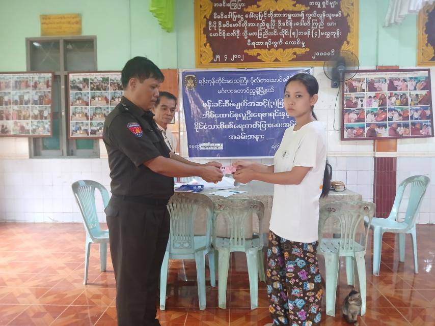 အဆိုပါ အိမ်ထောင်စုလူဦးရေစာရင်းနှင့် နိုင်ငံသားစိစစ်ရေးကတ်ပြားများအား မြို့နယ်လဝကမှူး ဦးလင်းထိန်ဦးဆောင်သောအဖွဲ့မှ မလွှကုန်းရပ်ကွက်ဓမ္မာရုံတွင် ကာယကံရှင်များထံသို့ လက်ဝယ်အရောက်ပေးအပ်ခဲ့ကြသည်။