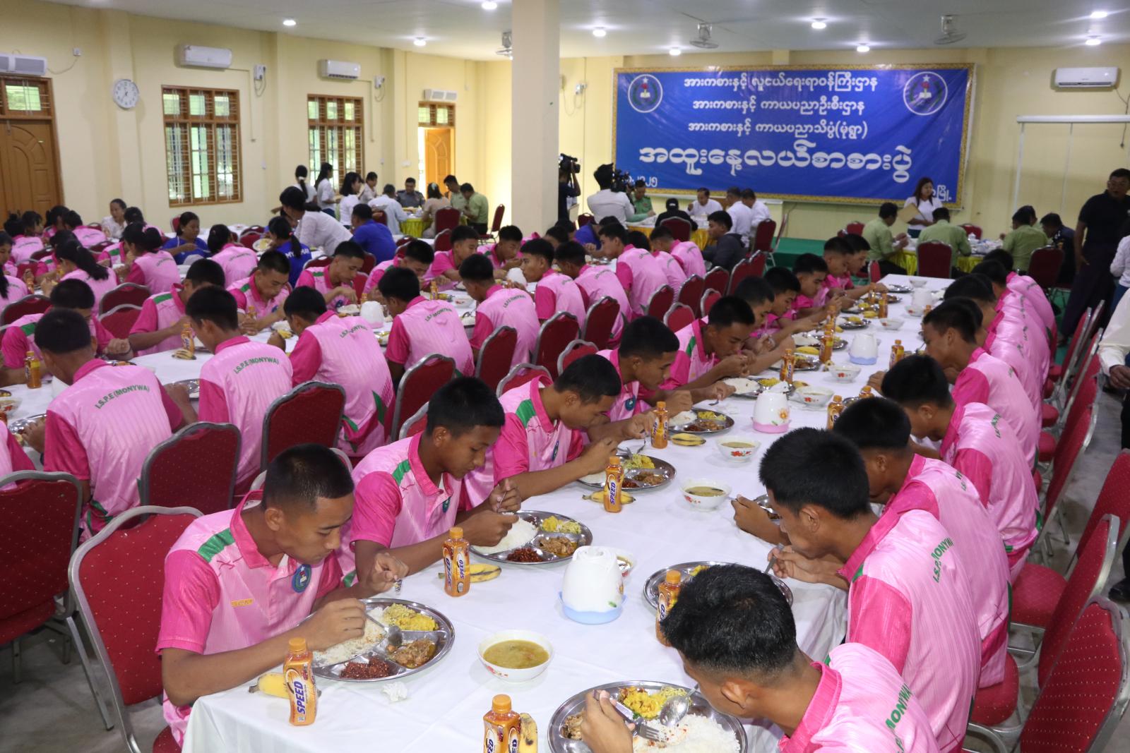 ဆက်လက်၍ တိုင်းဒေသကြီးဝန်ကြီးချုပ်နှင့် တာဝန်ရှိသူများသည် အဆိုပါကျောင်းရှိ စားရိပ်သာတွင် ကျောင်းအုပ်ကြီး၊ ဆရာ/ဆရာမများ၊ နည်းပြများ၊ သင်တန်းသား/ သင်တန်းသူများနှင့်အတူတကွ အထူးနေ့လယ်စာအား သုံးဆောင်ခဲ့ကြပြီး တိုင်းဒေသကြီး လူမှုရေးရာဝန်ကြီးက ကျောင်းအုပ်ကြီးထံ ငွေကျပ် - ၁၀ သိန်းအား ပေးအပ်ခဲ့ကြောင်း သိရသည်။