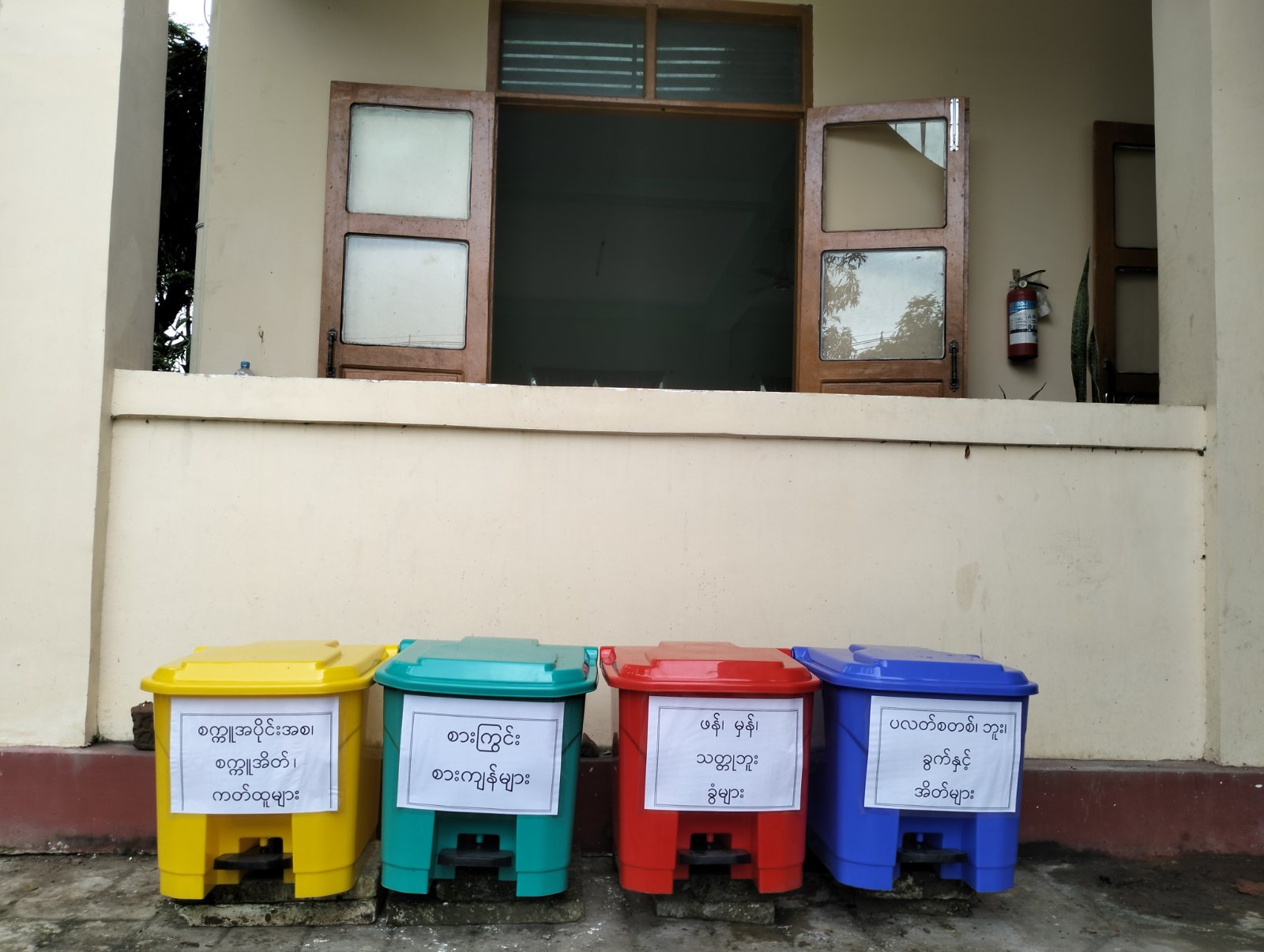 အမှိုက်များ စွန့်ပစ်ရာတွင် အမှိုက်ပုံးကို အဝါ၊ အစိမ်း၊ အနီ၊အပြာဖြင့်အရောင် လေးမျိုးခွဲခြားထားရှိပြီး၊ အမှိုက်စိုများဖြစ်သော မီးဖိုချောင်ထွက်ပစ္စည်းများနှင့် တစ်ကိုယ်ရေသုံး သန့်ရှင်းရေးပစ္စည်းများအတွက် အစိမ်းရောင်အမှိုက်ပုံးတွင်လည်းကောင်း၊ အမှိုက်ခြောက်များဖြစ်သော စက္ကူ၊ ကတ်ထူစက္ကူ၊သံတို သံစ၊ ပိတ်စ၊ သစ်သားစ စတဲ့စွန့်ပစ်ပစ္စည်းများအတွက် အဝါရောင်အမှိုက်ပုံးတွင်လည်းကောင်း၊ ပလတ်စတစ်အမှိုက်များဖြစ်သော ပလတ်စတစ်သုံးပစ္စည်းများအား အပြာရောင် အမှိုက်ပုံးတွင်လည်းကောင်း၊ အီလက်ထရွန်နစ် စွန့်ပစ်ပစ္စည်းများ၊ မီးလုံး၊ အင်းဆက်ဖျန်းဆေးရည်များ၊ အိမ်သုံးဓာတုစွန့်ပစ်ပစ္စည်းများ အစရှိတဲ့ ဘေးအန္တရာယ်ရှိ အမှိုက်များအတွက် အနီရောင်အမှိုက်ပုံးတွင်လည်းကောင်း စွန့်ပစ်ရမည်ဖြစ်သည်။