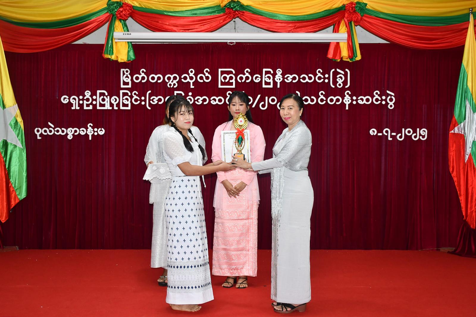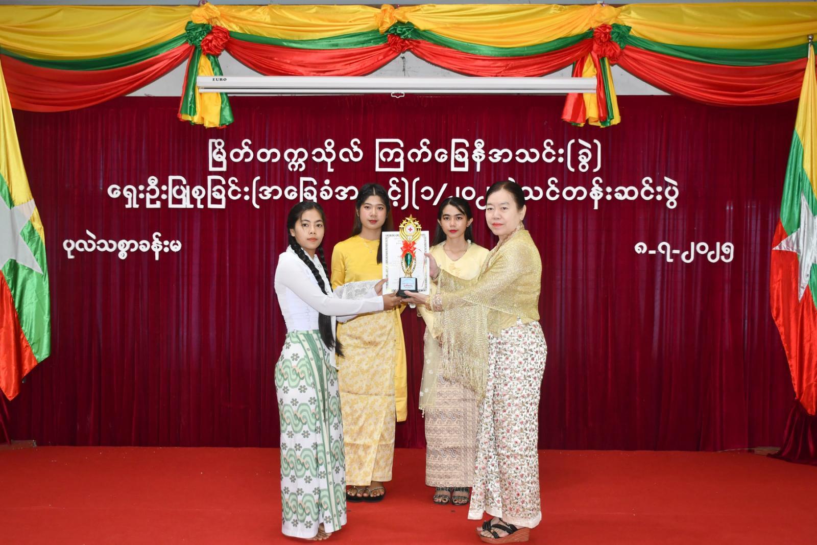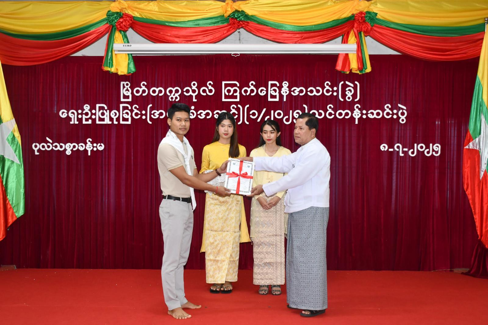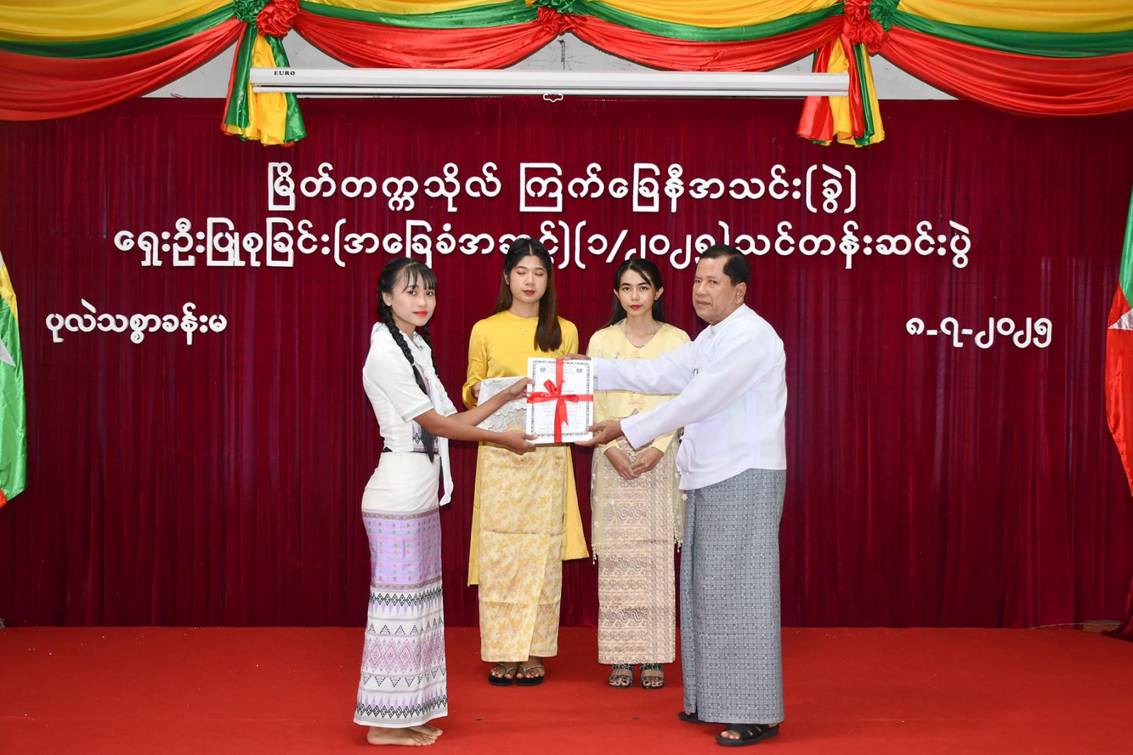 ဆက်လက်၍ သင်တန်းနည်းပြများအား ဂုဏ်ပြုလက်ဆောင်၊ သင်တန်းသား၊သင်တန်းသူများအတွက် သင်တန်း ဆင်း လက်မှတ်များ၊ သင်တန်းအောင်လက်မှတ်များ၊ သင်တန်းထူးချွန်ဆုရရှိသူများအား ဂုဏ်ပြုဆုများကို တက္ကသိုလ်ပါမောက္ခချုပ်နှင့် တာဝန်ရှိသူများကဆုများ ပေးအပ်ချီးမြှင့်ကြသည်။ ယင်းနောက် မြိတ်ခရိုင်ကြက်ခြေနီသူနာပြု တပ်ဖွဲ့မှ တက္ကသိုလ်ကြက်ခြေနီအသင်းခွဲသို့ ကြက်ခြေနီတံဆိပ်ပါ အင်္ကျီအထည် ၂၀ ပေးအပ်သည်။