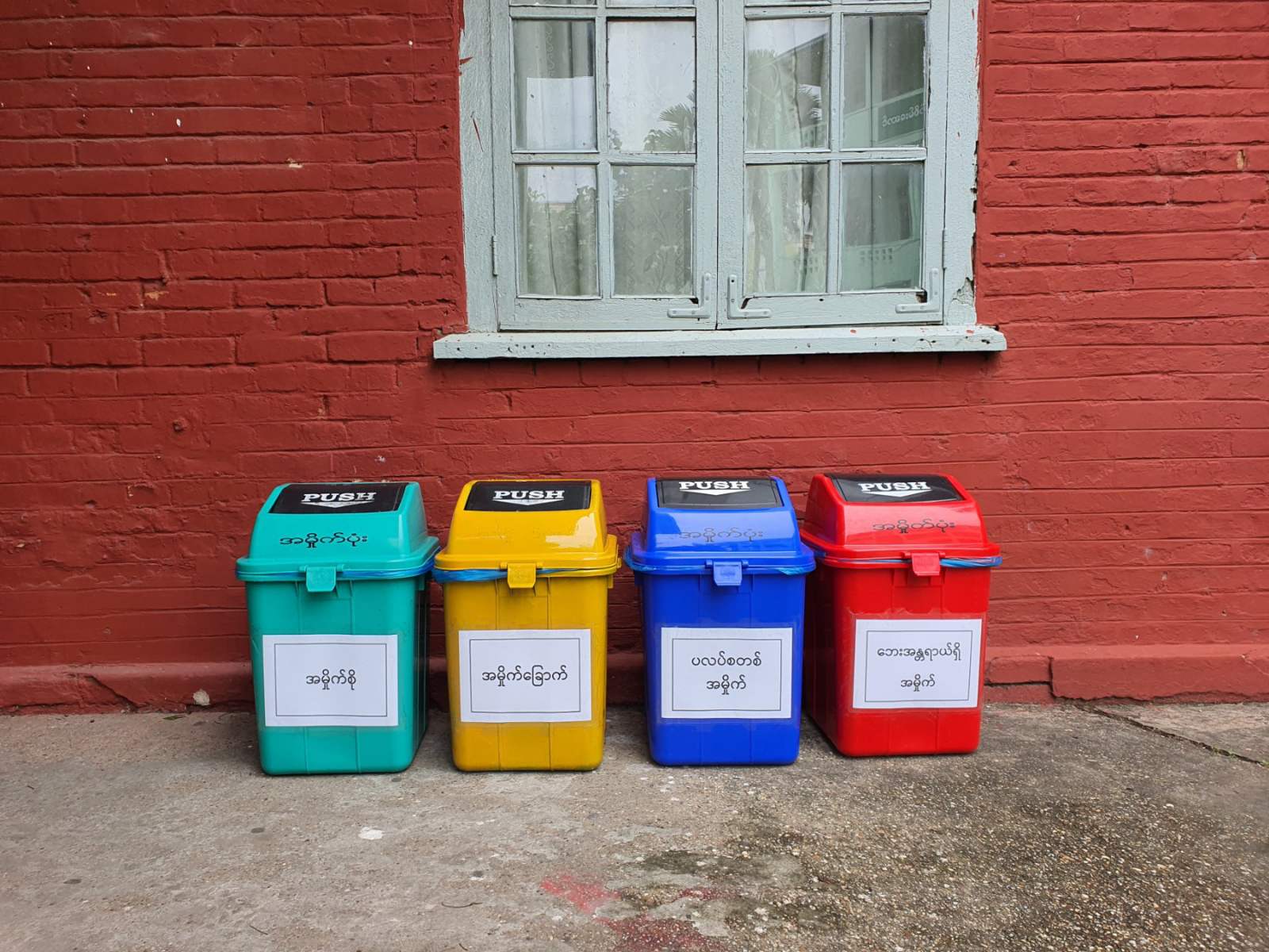 အနီရောင်ပုံးတွင် အန္တရာယ်ရှိသောပစ္စည်းများ (အသုံးပြုပြီးသော ဘက်ထရီအိုးများ၊ ရက်လွန်ဆေးဝါးများ၊ ဓာတုပစ္စည်းများ၊ မီးအိမ်ခွက်အဟောင်းများ) စွန့်ပစ်ရမည်ဖြစ်သည်။ အပြာရောင်အမှိုက်ပုံးတွင် မပျက်စီးလွယ်သောအမှိုက်များ (အ၀တ်အစားအဟောင်းများ၊ ပလပ်စတစ်မျိုးစုံ၊ ဆံပင်၊ တခါသုံးပလပ်စတစ်)များ စွန့်ပစ်ရမည်ဖြစ်ကြောင်း သိရသည်။