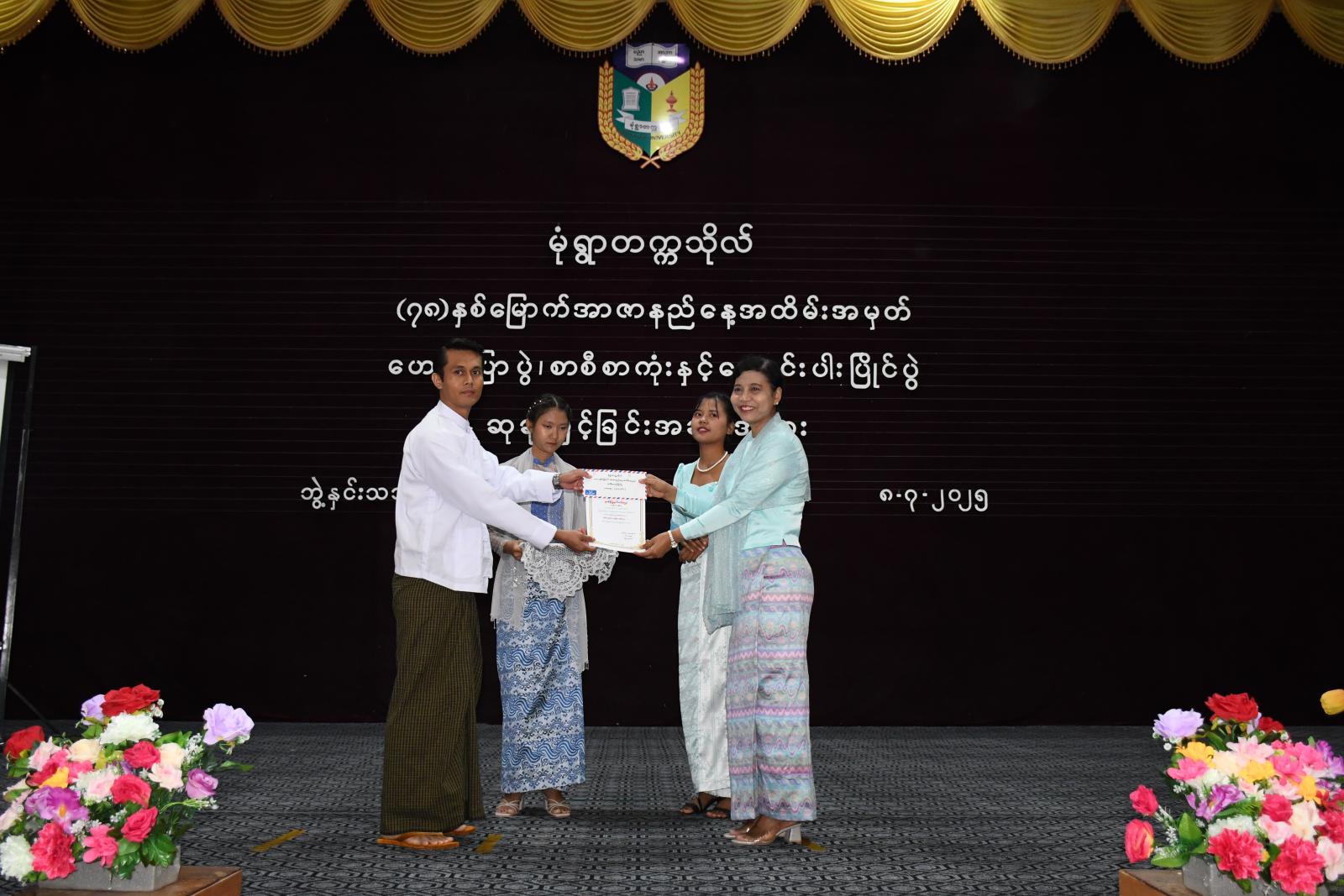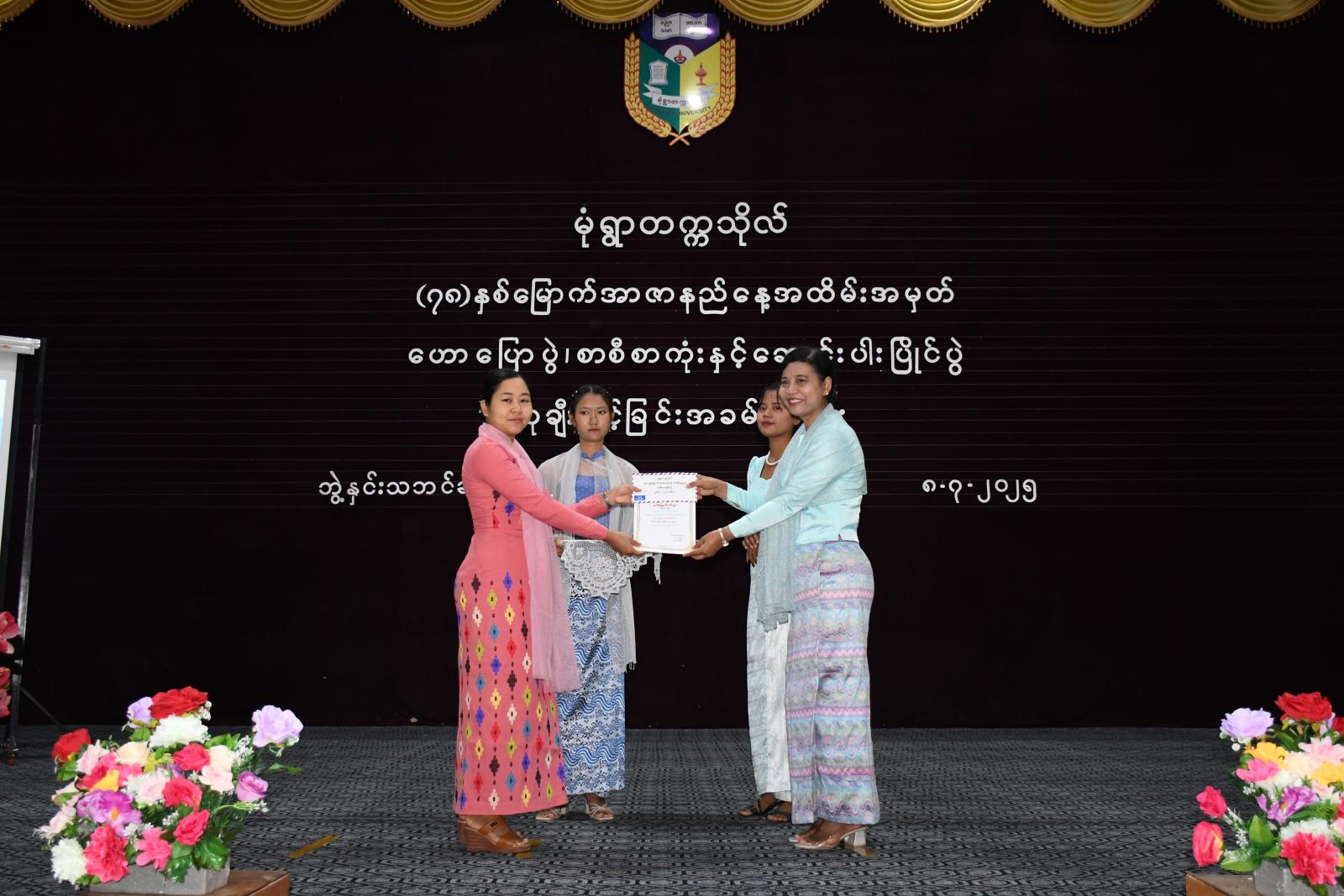 ဆက်လက်ပြီး စာစီစာကုံး၊ ဆောင်းပါးပြိုင်ပွဲများတွင် ပထမ၊ ဒုတိယ၊ တတိယဆုရရှိကြသည့်၊ ဆရာမများ၊ ကျောင်းသား/သူများအား၊ ဒုတိယပါမောက္ခချုပ်နှင့် တာဝန်ရှိသူများက ဆုများအသီးသီး ချီးမြှင့်ပေးအပ်ခဲ့ပြီး အမှတ်တရစုပေါင်းမှတ်တမ်းဓါတ်ပုံများ ရိုက်ကူးခဲ့ကြသည်။