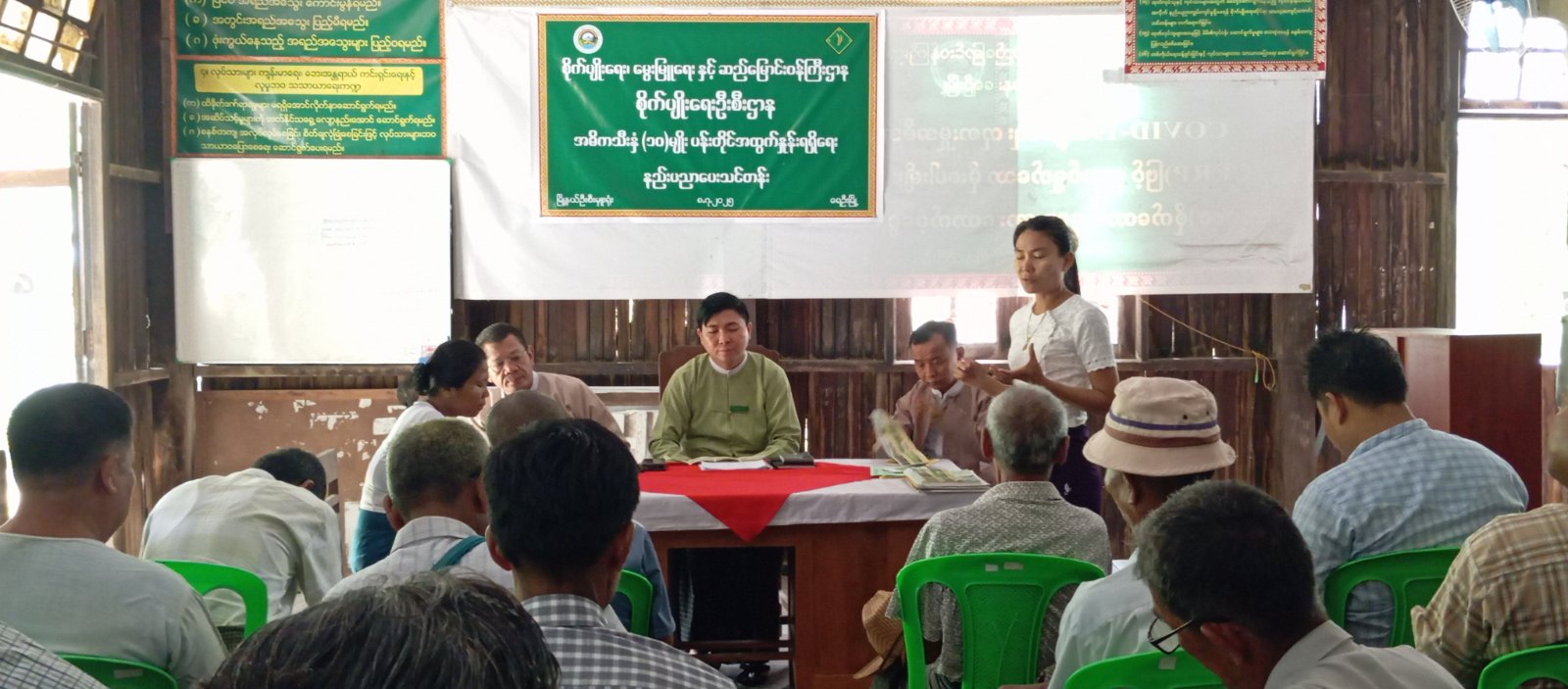 ရှေးဦးစွာ မြို့နယ်စီမံအုပ်ချုပ်ရေးအဖွဲ့ဥက္ကဋ္ဌ ဦးမင်းနိုင်ထွန်းက မြန်မာနိုင်ငံမှာ တွင်ကျယ်စွာ အသုံးပြုနေသော သီးနှံပုံစံများနှင့် အခြေခံရမည့် အချက်များ၊ ရာသီဥတုသုံးမျိုးနှင့်ကိုက်ညီသော မိုးသီးနှံ၊ ဆောင်းသီးနှံ၊ နွေသီးနှံတို့အတွက် စိုက်ပျိုးမည့် အချိန်ကာလ ရေးဆွဲသတ်မှတ် လုပ်ကိုင်ကြရန်နှင့် ဆီထွက်သီးနှံများ စိုက်ပျိုးကြရန် ပြောကြားခဲ့ပြီး မြန်မာ့လယ်ယာဖွံ့ဖြိုးရေးဘဏ် မန်နေဂျာ ဒေါ်ကေသွယ်ဝင်းမောင်က ချေးငွေကြွေးကျန် မရှိသော တောင်သူများအား ပုံစံ(၇)နှင့်အတူ စိုက်ပျိုးစရိတ် ချေးငွေများ ထုတ်ချေးပေးနေမှုကိုလည်းကောင်း၊ စိုက်ပျိုးရေးဦးစီးဌာန ဒုတိယဦးစီးမှူး ဒေါ်အေးငြိန်းသန့်က စပါးတင်း (၁၀၀)ထွက်ရှိရေး လိုက်နာဆောင်ရွက်ရမည့် အချက် (၁၄) ချက်ကိုလည်းကောင်း အသိပညာပေး ဆွေးနွေးခဲ့သည်။