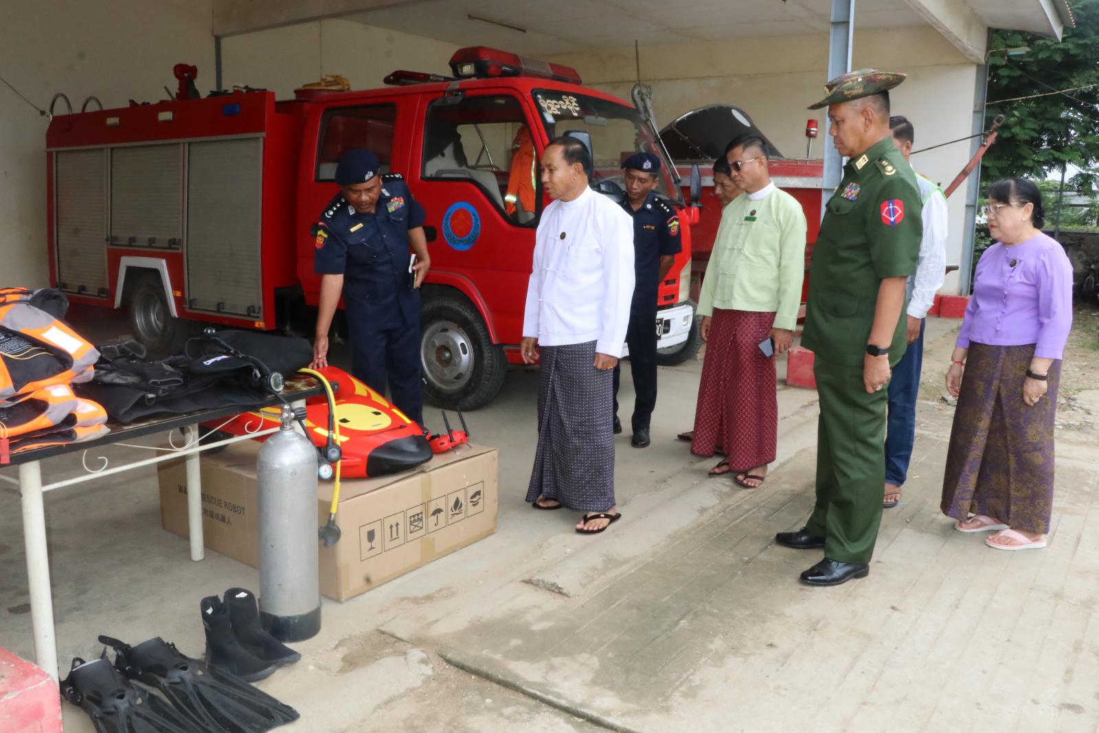 ဆက်လက်၍ တိုင်းဒေသကြီးဝန်ကြီးချုပ်နှင့် တာဝန်ရှိသူများသည် တိုင်းဒေသကြီး မီးသတ်ဦးစီးဌာနရုံးသို့ရောက်ရှိရာ သဘာဝဘေးအန္တရာယ်များ ဖြစ်ပေါ်လာပါက ရှာဖွေကယ်ဆယ်ရေးမော်တော်ယာဉ်ကြီးများ၊ အဆင့်မြင့်မီးငြိမ်းသတ်ယာဉ်ကြီးများနှင့် ရှာဖွေ ကယ်ဆယ်ရေးပစ္စည်းများ အသင့်ပြင်ဆင်ဆောင်ရွက်ထားရှိမှုများအား လိုက်လံကြည့်ရှုခဲ့ကြပြီး လိုအပ်သည်များကို တာဝန်ရှိသူများနှင့် ဖြည့်ဆည်းပေါင်းစပ်ဆောင်ရွက်ပေးခဲ့သည်။