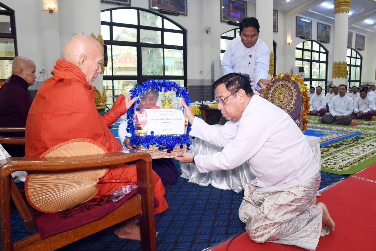 ဆက်လက်၍ တိုင်းဒေသကြီးဝန်ကြီးချုပ်ဦးမြတ်ကိုက သာသနာရေးဆိုင်ရာများ လျှောက်ထားပြီး တိုင်းဒေသကြီးဝန်ကြီးချုပ်၊ တိုင်းဒေသကြီးတရားလွှတ်တော်တရားသူကြီးချုပ်၊ တိုင်းဒေသကြီးဝန်ကြီးများနှင့် တာဝန်ရှိသူများက ဆရာတော်သံဃာတော်အရှင်သူမြတ်များအား ဝါဆိုသင်္ကန်းနှင့် လှူဖွယ်ပစ္စည်းများဆက်ကပ်လှူဒါန်းကာ ထားဝယ်မြို့၊ ဃောသိတာ ရာမ ပါဠိတက္ကသိုလ်ကျောင်း တိုက်ပဓာနနာယက နိုင်ငံတော်ဩဝါဒါစရိယ၊ အဂ္ဂမဟာပဏ္ဍိတ ဘဒ္ဒန္တပညာသာမိထံမှ လှူဒါန်းမှုအစုစုအတွက် အနုမောဒနာတရား နာကြား၍ ရေစက်သွန်းချအမျှပေး ဝေကြကာ “ဗုဒ္ဓသာသနံ စိရံ တိဋ္ဌတုသုံးကြိမ် ရွတ်ဆိုဆုတောင်းကာ အခမ်းအနားကို ရုပ်သိမ်းလိုက်သည်။