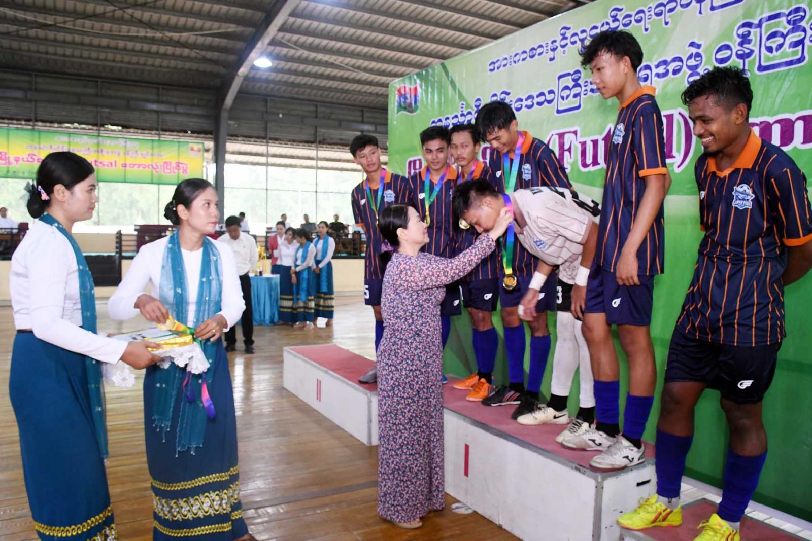 ထိုနောက်ဆုချီးမြှင့်ပွဲအခမ်းအနားကို ဆက်လက်ကျင်းပရာ တိုင်းဒေသကြီးလူမှုရေးရာဝန်ကြီးဦးသက်နိုင် က ပြိုင်ပွဲတစ်လျှောက် ကူညီဆောင်ရွက်ပေးသည့် ကြက်ခြေနီတပ်ဖွဲ့အားဂုဏ်ပြုဆုချီးမြှင့်ပြီး တိုင်းဒေသကြီး စီးပွားရေးရာဝန်ကြီးဦးမောင်ကြီးက ဒုတိယဆုရရှိသည့် လောင်းလုံးမြို့နယ်အသင်းအား တစ်ဦးချင်းဆုနှင့်ငွေသားဆုပေးအပ်ချီးမြှင့်သည်။