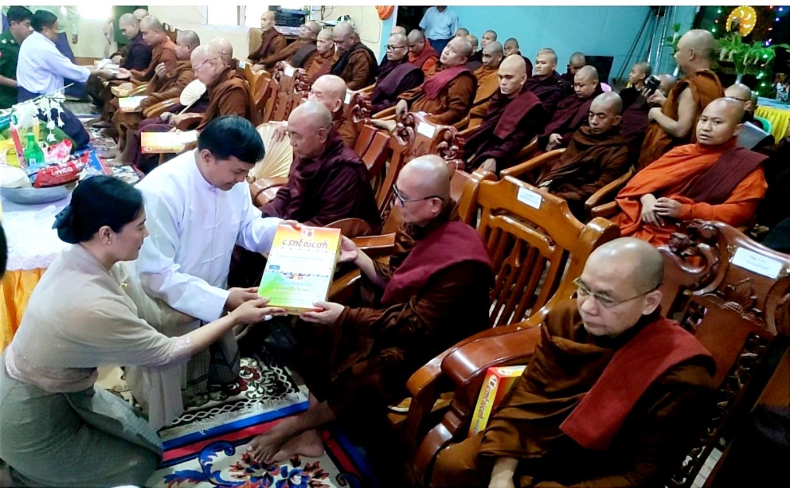 ဆရာတော်သံဃာတော်များမှ မေတ္တာသုတ်ပရိတ်တရားတော်များ ရွတ်ပွားသရဇ္ဇျယ်ခြင်းများ ပြုလုပ်ပေးခဲ့ပြီး “ဗုဒ္ဓသာသနံ စိရံတိဠတု”သုံးကြိမ်ရွတ်ဆို၍ အခမ်းအနား ပြီးမြောက်အောင်မြင်ခဲ့သည်။ ထို့နောက်ဆရာတော် သံဃာတော်များအား၊နေ့ဆွမ်းဆက်ကပ်လှူဒါန်းခဲ့ကြပြီး ဝါဆိုသင်္ကန်း၊ ဆန်၊ ဆီ၊ ဝတ္ထုငွေ စုစုပေါင်း တန်ဘိုး (၁၅၆၀၀၀၀၀)ကျော် လှူဒါန်းနိုင်ခဲ့ကြောင်း သိရသည်။