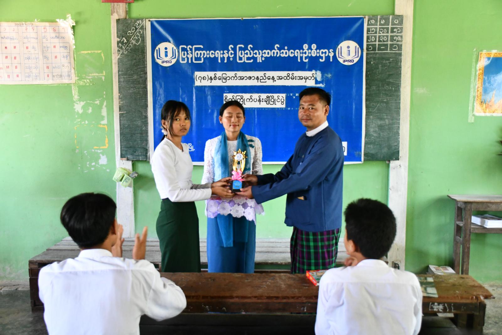 ဆက်လက်၍ စိတ်ကြိုက်ပန်းချီပြိုင်ပွဲတွင် ဆုရရှိကြသည့် ကျောင်းသား၊ ကျောင်းသူများအား ဟုမ္မလင်းမြို့နယ်၊ ပြန်ကြားရေးနှင့်ပြည်သူ့ဆက်ဆံရေးဦးစီးဌာနမှ မြို့နယ်ဦးစီးမှူး ဦးဧဆက်၊ ကျောင်းအုပ်ဆရာကြီး ဦးသန်းနိုင်ဉီးနှင့် တာဝန်ရှိသူများက ဆုလဒ်များအသီးသီး ပေးအပ် ချီးမြှင့်ခဲ့ကြသည်။