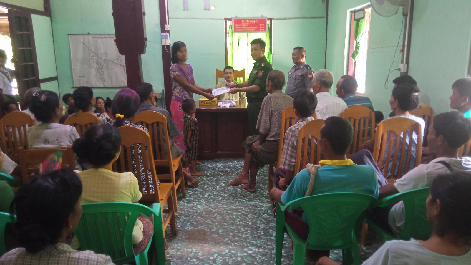 စစ်ကိုင်းတိုင်းဒေသကြီး၊ ချောင်းဦးမြို့နယ် အထွေထွေအုပ်ချုပ်ရေးဦးစီးဌာန ရုံးခန်းမ၌ ယမန်နေ့ နေ့လယ်ပိုင်းက ယာယီနေရပ်စွန့်ခွာလာသည့် ပြည်သူများအား ထောက်ပံ့ငွေများ ပေးအပ်ခဲ့သည်။