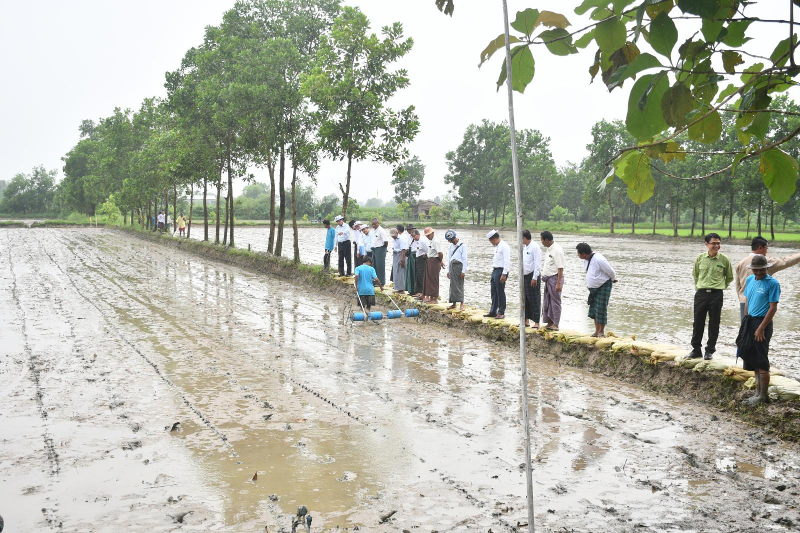 ထို့နောက် ရန်ကုန်တိုင်းဒေသကြီးအစိုးရအဖွဲ့ ဝန်ကြီးချုပ် ဦးစိုးသိန်းနှင့်အဖွဲ့က လယ်ထွန်စက်ကြီးများဖြင့် ထွန်ယက်နေမှုများ၊ တိုက်ရိုက်အစေ့ချ ကိရိယာ (Seeder) ဖြင့် သရုပ်ပြစိုက်ပျိုးနေမှု၊ ကောက်စိုက်စက်ဖြင့် စိုက်ပျိုးခြင်း သရုပ်ပြနေမှု၊ လက်ဆွဲကောက်စိုက်စက်ဖြင့် စိုက်ပျိုးခြင်း သရုပ်ပြနေမှု၊ စက်မှုလယ်ယာဦးစီးဌာနနှင့် သမဝါယမဦးစီးဌာနတို့မှ ခင်းကျင်းပြသထားသည့် လယ်မြေပြုပြင်ရန် မြေဆွေးမြေဩဇာ ဆောင်ရွက်ထားရှိမှု၊ အပင်အားဆေး ဆောင်ရွက်ထားရှိမှုနှင့် EM ဘိုကာချီမြေဆွေးများ ဆောင်ရွက်ထားရှိမှုတို့ကို လှည့်လည်ကြည့်ရှုအားပေးပြီး တိုက်ရိုက်မျိုးစေ့ချကိရိယာ (Seeder) ဖြင့် သရုပ်ပြစိုက်ပျိုးခဲ့သည့် တောင်သူများအား ဂုဏ်ပြုချီးမြှင့်ငွေများ ပေးအပ်ကာ တက်ရောက်လာကြသည့် တောင်သူများအား ရင်းရင်းနှီးနှီး တွေ့ဆုံနှုတ်ဆက်စကား ပြောကြားခဲ့ကြောင်း သိရသည်။