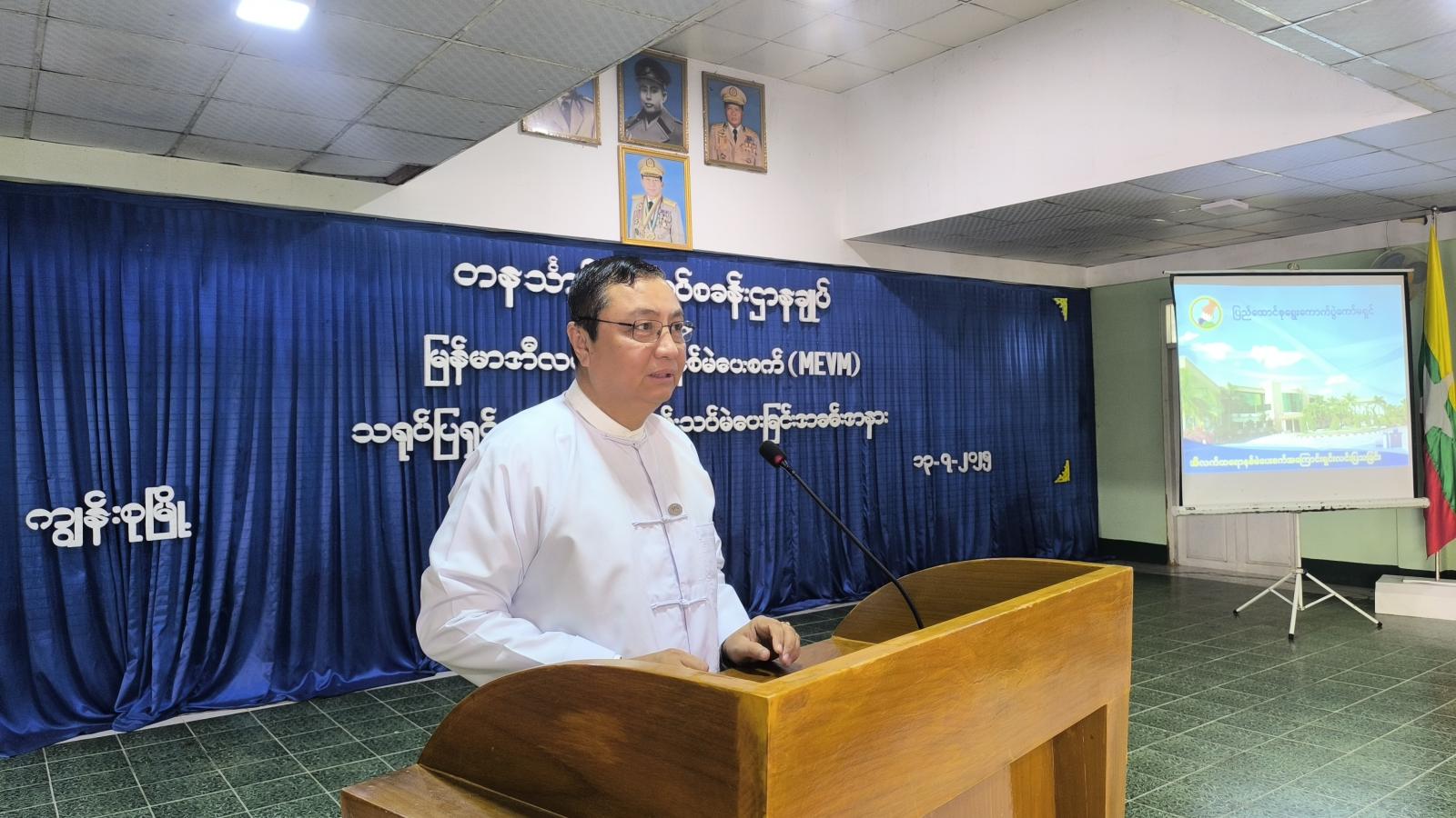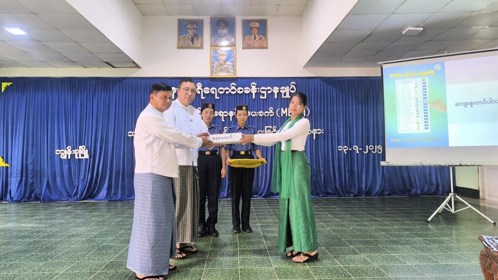 ထို့နောက် ပြည်ထောင်စုရွေးကောက်ပွဲကော်မရှင်ရုံးမှ ဒုတိယညွှန်ကြားရေးမှူးချုပ် ဦးညီညီလွင်က MEVM စက်အသုံးပြုရခြင်းနှင့်စပ်လျဉ်း၍ Power Point ဖြင့် ရှင်းလင်းပြောကြားပြီး ရွှေအဏ္ဏဝါပညာရေးဖောင်ဒေးရှင်းအတွက် လှူဒါန်းငွေများအား စေတနာရှင် အလှူရှင်များက ပေးအပ်ခဲ့ရာ တာဝန်ရှိသူများက လက်ခံရယူခဲ့ကာ တနင်္သာရီရေတပ်စခန်းဌာနချုပ်၊ ဌာနချုပ်မှူး ဗိုလ်မှူးချုပ် အောင်အောင်နိုင်က ဂုဏ်ပြုမှတ်တမ်းလွှာများအား ပြန်လည်ပေးအပ်သည်။