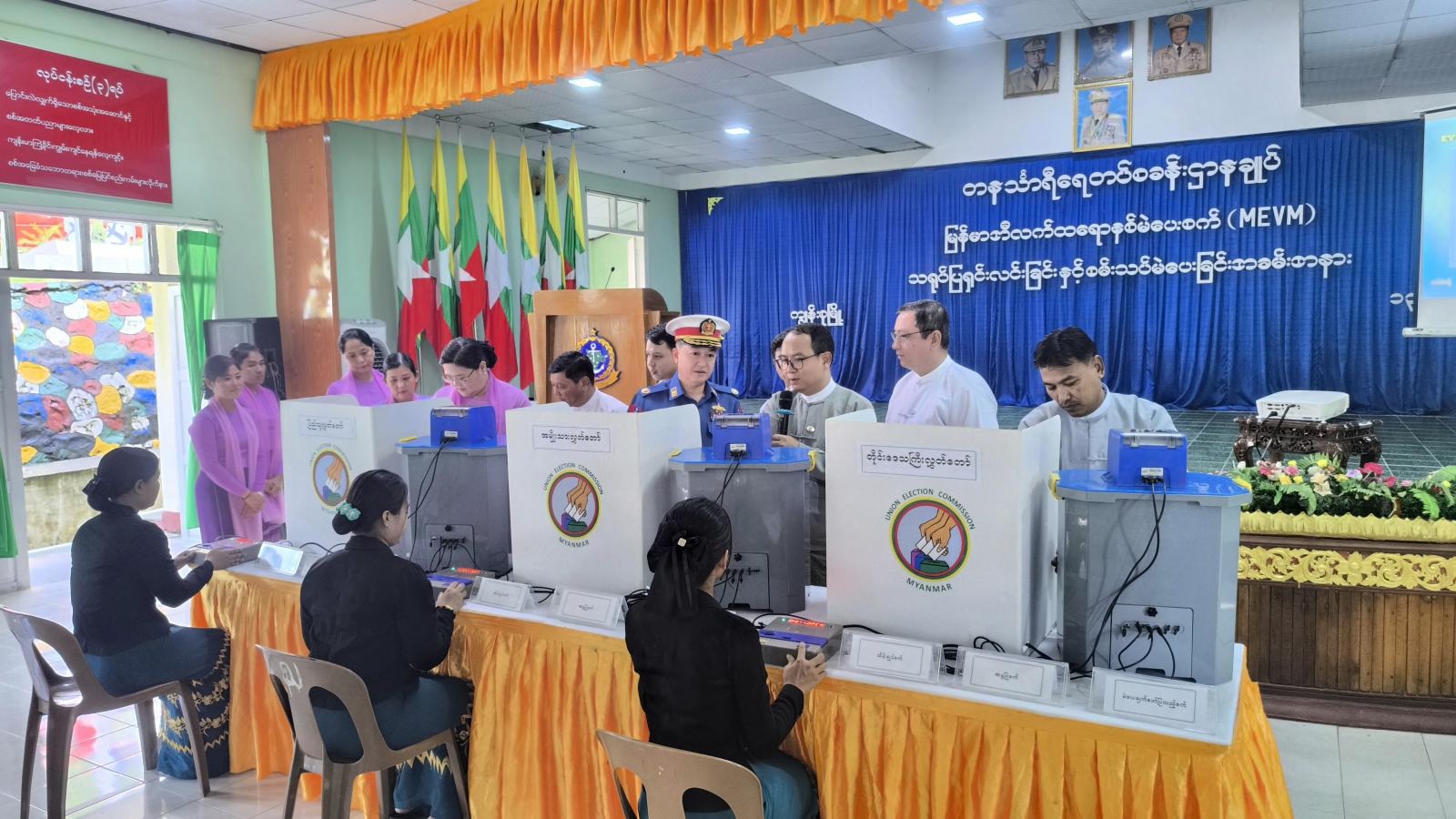 ပြည်ထောင်စုရွေးကောက်ပွဲကော်မရှင်အဖွဲ့ဝင် ဦးကိုကိုလွင်၊ တနင်္သာရီတိုင်းဒေသကြီးအစိုးရအဖွဲ့၊ လမ်းပန်းဆက်သွယ်ရေးဝန်ကြီး ဦးအောင်ဇော်လှိုင်နှင့် တာဝန်ရှိသူများသည် ယနေ့နံနက် ၉ နာရီအချိန်က တနင်္သာရီတိုင်းဒေသကြီး၊ မြိတ်ခရိုင်၊ ကျွန်းစုမြို့နယ်၊ တနင်္သာရီခန်းမ၌ ပြည်ထောင်စုရွေးကောက်ပွဲကော်မရှင် မြို့နယ်ရွေးကောက်ပွဲကော်မရှင်အဖွဲ့ခွဲမှ ကြီးမှူးကျင်းပသည့် မြန်မာအီလက်ထရောနစ်မဲပေးစက် (MEVM) ရှင်းလင်းပြသခြင်း၊ သရုပ်ပြစမ်းသပ်မဲပေးခြင်းအခမ်းအနားတက်ရောက်သည်ဦးစွာ ပြည်ထောင်စုရွေးကောက်ပွဲကော်မရှင်အဖွဲ့ဝင် (တနင်္သာရီတိုင်းဒေသကြီးတာဝန်ခံ) ဦးကိုကိုလွင်က ရွေးကောက် ပွဲတွင် အီလက်ထရောနစ်စက် (MEVM)ဖြင့် မဲပေးကြရမည်ဖြစ်ရာ မဲစာရင်းများကို မှန်မှန်ကန်ကန်တိတိကျကျ မြန်မြန်ဆန်ဆန် ဆောင်ရွက်နိုင်မည်ဖြစ်ကြောင်း ပြောကြားပြီး တိုင်းဒေသကြီးအစိုးရအဖွဲ့၊ လမ်းပန်းဆက်သွယ်ရေးဝန်ကြီး ဦးအောင်ဇော်လှိုင်က လွတ်လပ်ပြီး တရားမျှတသည့် ပါတီစုံဒီမိုကရေစီရွေးကောက်ပွဲသည် နိုင်ငံတော်၏ အဓိကရည်မှန်းချက်ဖြစ်သည့်အတွက် နိုင်ငံသားတိုင်း မဲပေးနိုင်ရေး၊ နည်းလမ်းကျမှန်ကန်သည့် အထွေထွေရွေးကောက်ပွဲပုံစံဖြစ်စေရေးနှင့် ရွေးကောက်ပွဲလုပ်ငန်းများကို အောင်မြင်စွာဆောင်ရွက်သွားမည်ဖြစ်ကြောင်းနှင့် (MEVM)စက်များသယ်ယူဖြန့်ဝေထိန်းသိမ်းထားရှိမှုများ အား ပြောကြားခဲ့သည်။