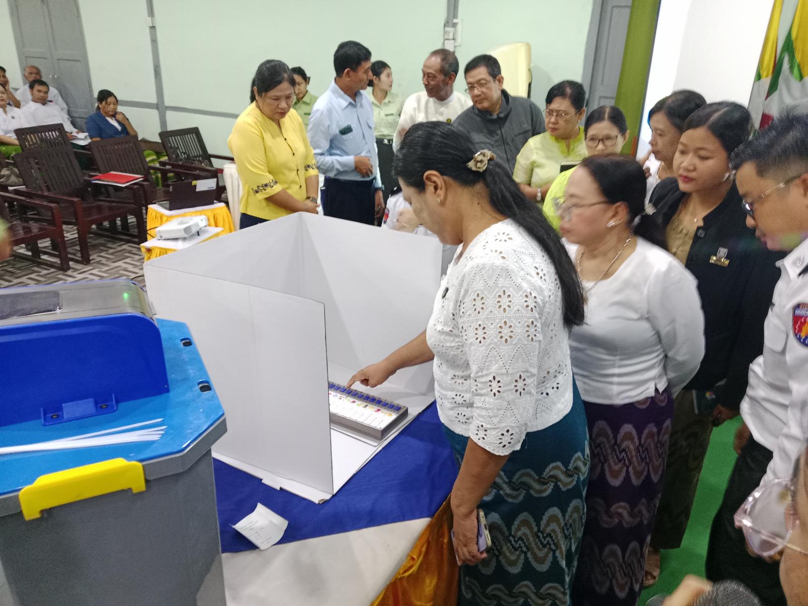 ယင်းနောက် အခမ်းအနားသို့တက်ရောက်လာကြသော ဌာနဆိုင်ရာအကြီးအကဲများမှ မဲပေးစက်ဖြင့် လက်တွေ့စမ်းသပ် ခလုတ်နှိပ်မဲပေးခဲ့ကြောင်း သိရသည်။