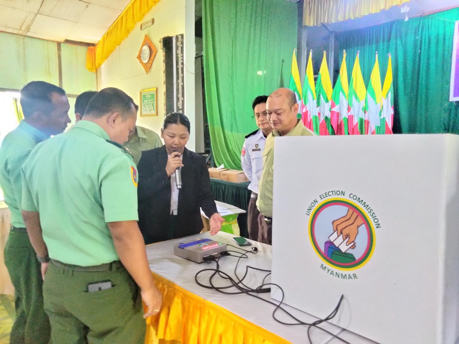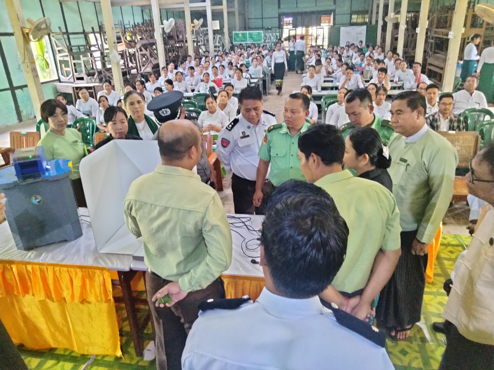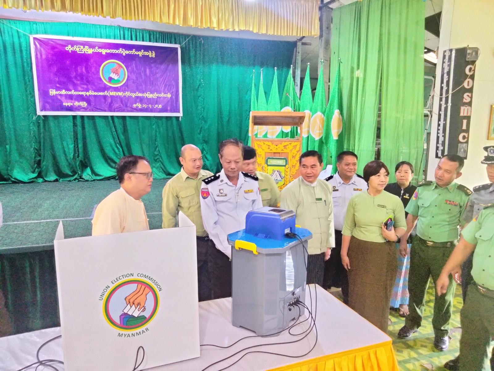 ထို့နောက် ခရိုင်စီမံအုပ်ချုပ်ရေးအဖွဲ့ဝင်များ၊ မြို့နယ်စီမံအုပ်ချုပ်ရေးအဖွဲ့ဝင်များ၊ ခရိုင်/မြို့နယ်အဆင့် ဌာနဆိုင်ရာတာဝန်ရှိသူများ၊ ခရိုင်/မြို့နယ်ရွေးကောက်ပွဲကော်မရှင်အဖွဲ့ခွဲမှ တာဝန်ရှိသူများက မြန်မာအီလက်ထရောနစ်မဲပေးစက်အသုံးပြု၍ လက်တွေ့စမ်းသပ် မဲပေးခြင်းကို သရုပ်ပြဆောင်ရွက်ခဲ့ကြောင်း သိရသည်။