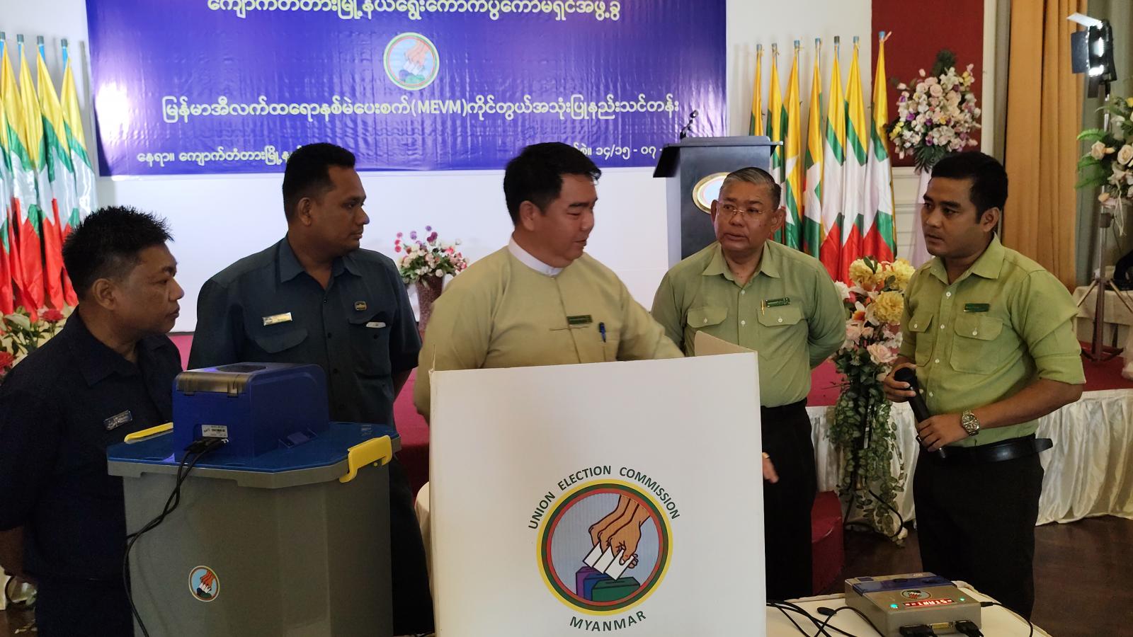 ထို့နောက် သင်တန်းနည်းပြများက မြန်မာအီလက်ထရောနစ်စက်ဖြင့် မဲပေးနည်းအား သရုပ်ပြရှင်းလင်းရာ ခရိုင်စီမံအုပ်ချုပ်ရေးအဖွဲ့ဥက္ကဋ္ဌ ဦးဥက္ကာနှင့်အဖွဲ့ဝင်များ၊ မြို့နယ်စီမံအုပ်ချုပ်ရေးအဖွဲ့ဥက္ကဋ္ဌ ဦးမိုးထွေးဦးနှင့်အဖွဲ့ဝင်များ၊ ဌာနဆိုင်ရာများက ကြည့်ရှုကြသည်။
