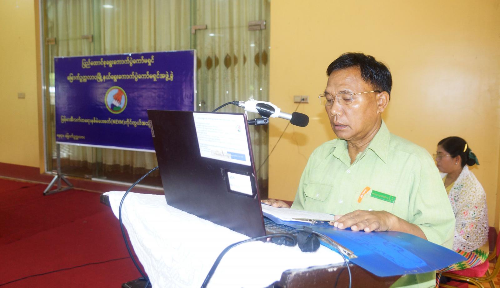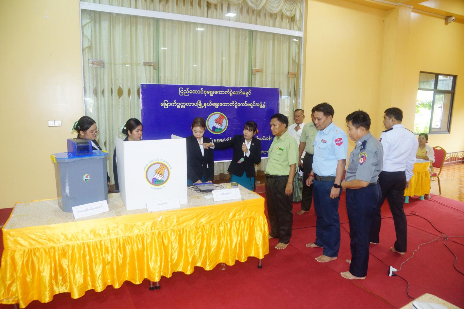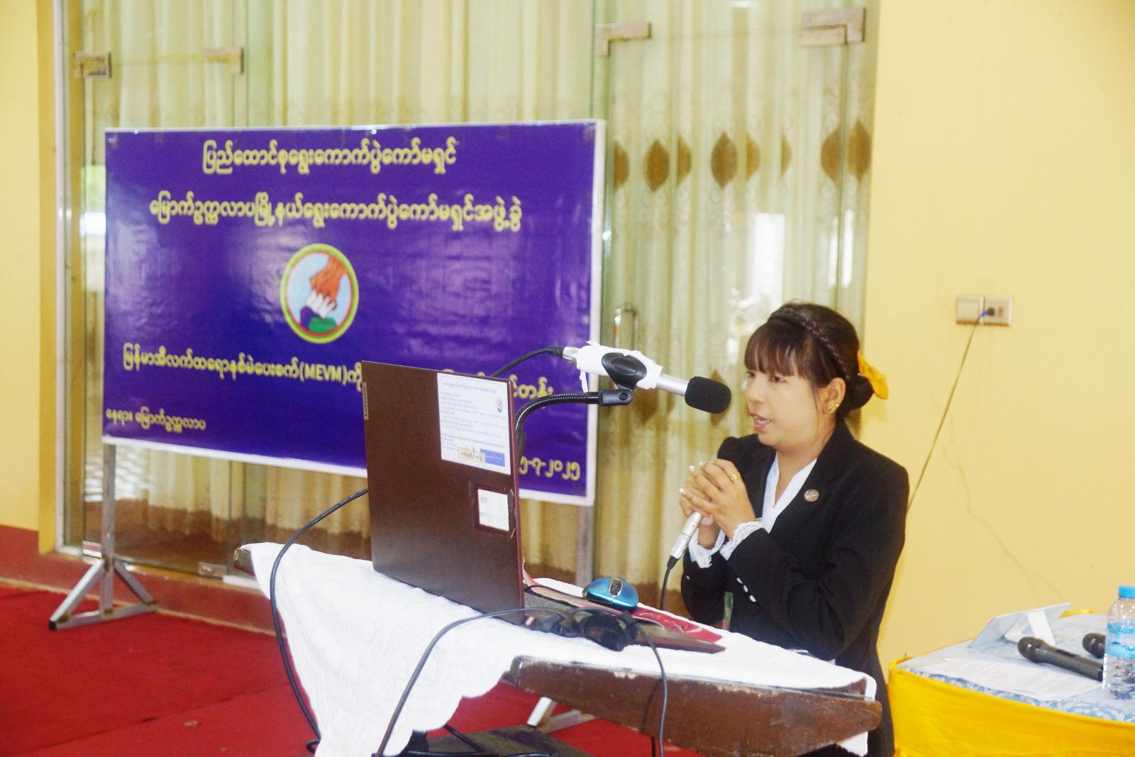 ဦးစွာ မြို့နယ်စီမံအုပ်ချုပ်ရေးအဖွဲ့ဥက္ကဋ္ဌ ဦးအောင်လောဟာက အဖွင့်အမှာစကားပြောကြားပြီး မြို့နယ်ရွေးကောက်ပွဲအရာရှိ ဒေါ်ဝေမာခင်က သင်တန်းဖွင့်လှစ်ရခြင်းနှင့်ပတ်သက်၍ Power Point ဖြင့် အသေးစိတ်ရှင်းလင်းပြောကြားခဲ့သည်။ အဆိုပါ မြန်မာအီလက်ထရောနစ်မဲပေးစက်(MEVM) ကိုင်တွယ်အသုံးပြုနည်းသင်တန်းကို သင်တန်းနည်းပြဆရာများမှ အီလက်ထရောနစ်မဲပေးစက် ဖွဲ့စည်းတည်ဆောက်ပုံ၊ အီလက်ထရောနစ်မဲပေးစက်များ စစ်ဆေးခြင်း၊ ရွေးကောက်ပွဲနေ့မတိုင်မီ မဲရုံတွင် မဲပေးစက်များ ကြိုတင်ပြင်ဆင်ခြင်းနှင့်စမ်းသပ်ခြင်း၊ ရွေးကောက်ပွဲကျင်းပမည့်နေ့တွင် စမ်းသပ်မဲပေးခြင်း၊ မဲပေးချိန်တွင် မဲပေးစက်များကိုင်တွယ်ခြင်း၊ အရန်စက်လဲလှယ်ရန်အခြေအနေ၊ မဲရေတွက်ခြင်း၊ မဲပေးနေစဉ်အတွင်း အရေးပေါ်ကိစ္စရပ်များ ဖြစ်ပေါ်လာပါက ဆောင်ရွက်ရမည့်လုပ်ငန်းများ၊ ဆန္ဒမဲဖြတ်ပိုင်းများ ရေတွက်ရမည့်အခြေအနေ စသည့်အကြောင်းအရာများကို စာတွေ့လက်တွေ့ စနစ်တကျသင်ကြားပို့ချမည်ဖြစ်ကြောင်း သိရသည်။