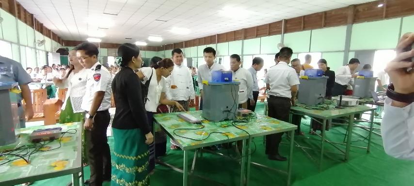 အဆိုပါသင်တန်းဖွင့်ပွဲအခမ်းအနားသို့ မှော်ဘီမြို့နယ်စီမံအုပ်ချုပ်ရေးအဖွဲ့ အဖွဲ့ဝင် (၂) ဦးဝင်းစိုးက မြန်မာအီလက်ထရောနစ် မဲပေးစက်(MEVM)ကိုင်တွယ်အသုံးပြုနည်းဆိုင်ရာ သင်တန်းဖွင့်ပွဲ အဖွင့်အမှာစကားပြောကြားခြင်း မြို့နယ်ရွေးကောက်ပွဲကော်မရှင်အဖွဲ့ခွဲ အတွင်းရေးမှူး ဒေါ်တင်ဇာလွင်က မဲပေးစက်ကိုင်တွယ်အသုံးပြုပုံပြုနည်းများအား ရှင်းလင်းပြောကြားကာ မြို့နယ်စီမံအုပ်ချုပ်ရေးအဖွဲ့ဝင်များ၊ မြို့နယ်ရွေးကောက်ပွဲကော်မရှင်အဖွဲ့ဝင်ဌာနဆိုင်ရာများက မြန်မာအီလက်ထရောနစ် မဲပေးစက်(MEVM) ဖြင့် စမ်းသပ်မဲပေးခဲ့ကြကြောင်း သိရသည်။