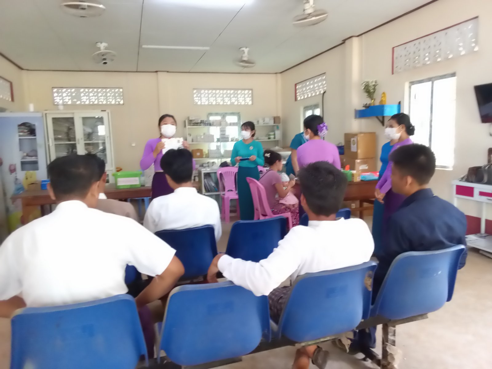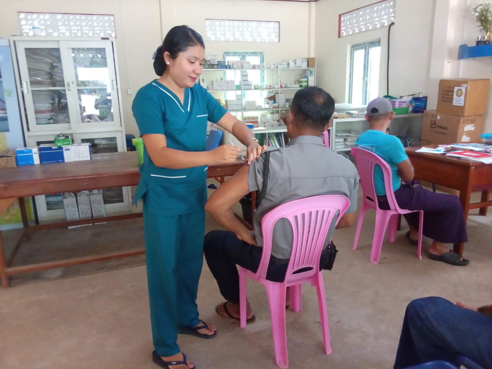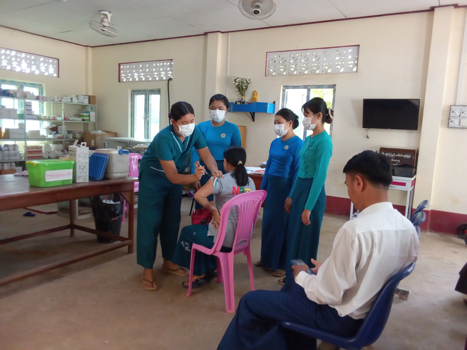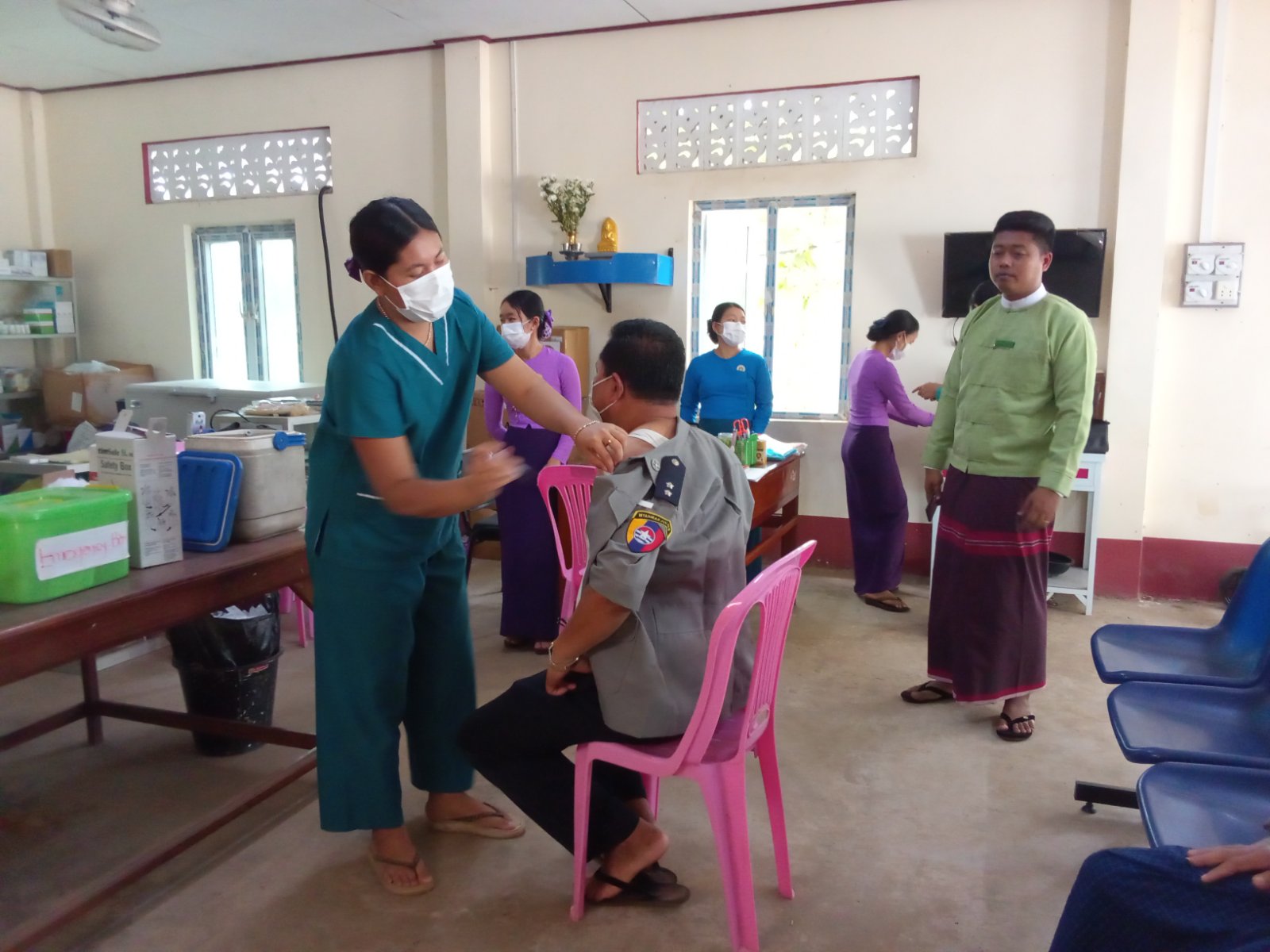 ရှေးဦးစွာ ကာကွယ်ဆေးလာရောက်ထိုးနှံကြသည့် နိုင်ငံ့ဝန်ထမ်းများနှင့် အသက်(၁၈)နှစ်နှင့်အထက် ဝန်ထမ်းမိသားစုဝင်များအား ကျန်းမာရေး ဝန်ထမ်းများက စာရင်းရေးသွင်းခြင်းနှင့် သွေးပေါင်ချိန်တိုင်းတာခြင်းတို့ကို ဆောင်ရွက်ပေး၍ ကိုဗစ်-၁၉ ရောဂါကာကွယ်ဆေး စနစ်တကျထိုးနှံပေးလျက်ရှိပြီး ဆေးထိုးနှံပြီးသူ များလည်း မိနစ်(၃၀) စောင့်ကြည့်၍ လိုအပ်သည့် ကျန်းမာရေးစောင့်ရှောက်မှုများဆောင်ရွက်ပေးလျက်ရှိသည်။