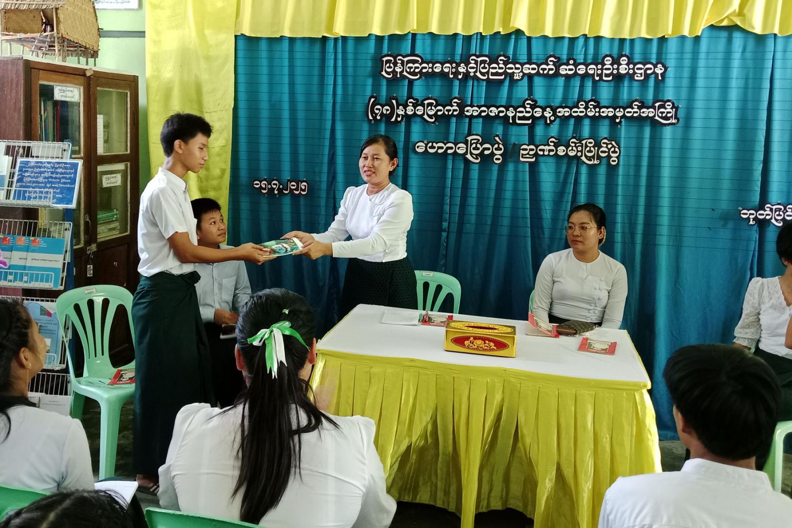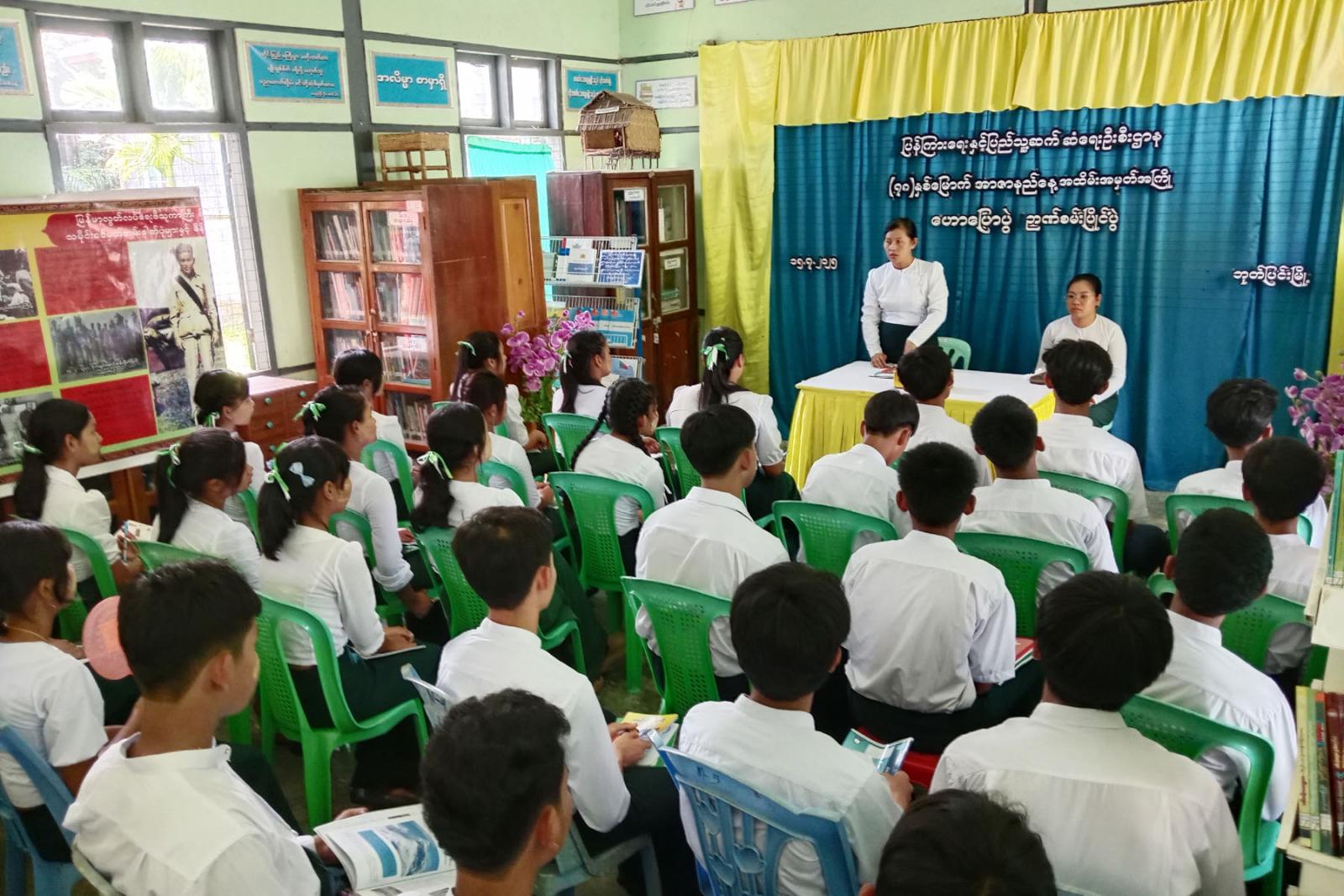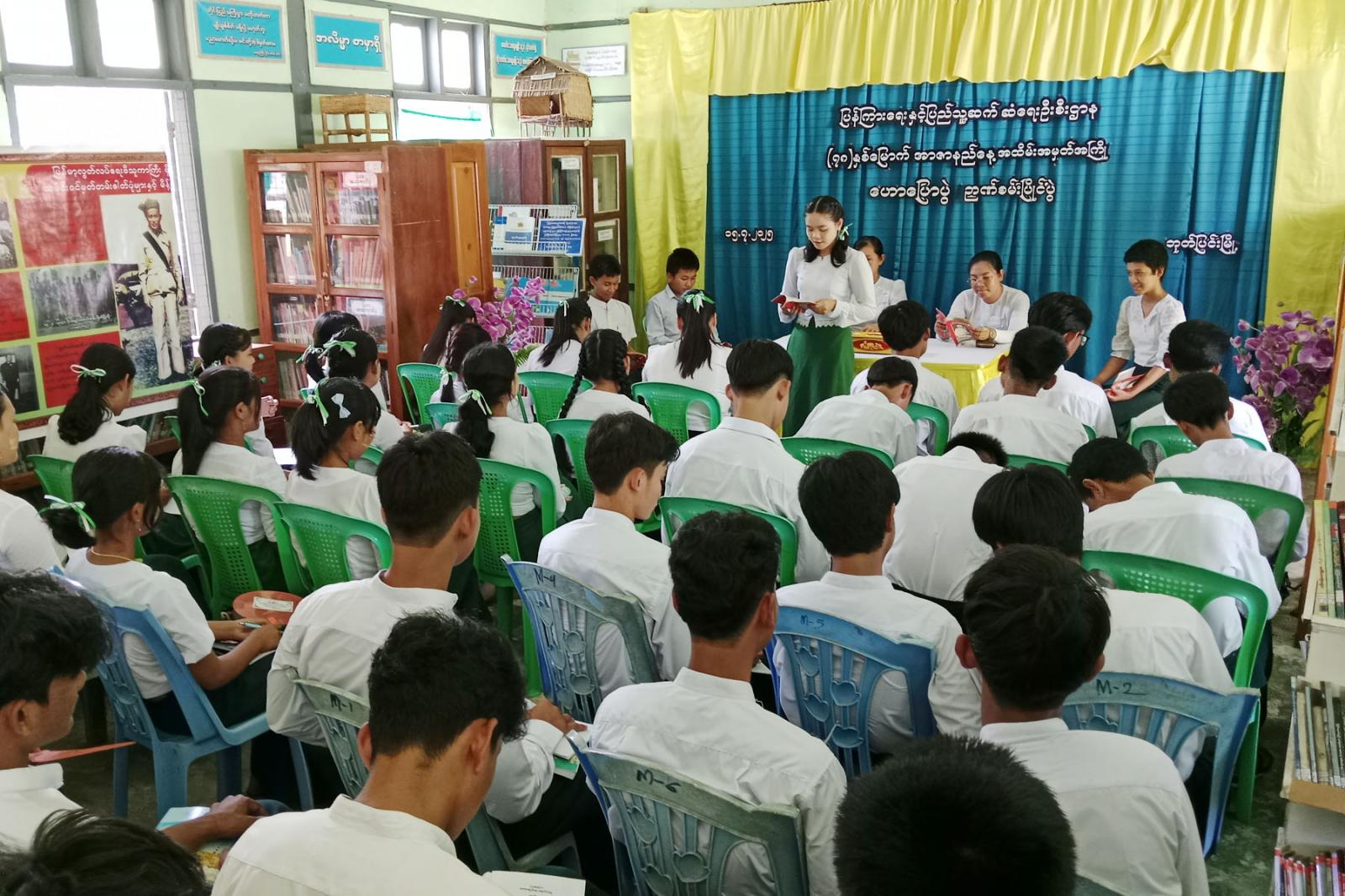 ဆက်လက်၍ အာဇာနည်နေ့နှင့်ပတ်သည့် ဉာဏ်စမ်းပြိုင်ပွဲနှင့် စာဖတ်စွမ်းရည်ပြိုင်ပွဲကိုကျင်းပရာ အထက-ဘုတ်ပြင်းကျောင်း Garde-10 ကျောင်းသားကျောင်းသူများ ပါဝင်ယှဉ်ပြိုင်ကြပြီး မြို့နယ်ဦးစီးမှူးနှင့်တာဝန်ရှိသူများက အမှတ်တရ လက်ဆောင်များ ပေးအပ်ခဲ့သည်။