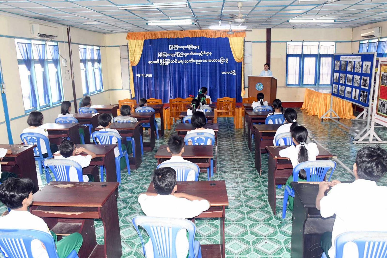 ဆက်လက်၍ ကျောင်းသား/ကျောင်းသူများက ခန်းမအတွင်းခင်းကျင်းပြသထားသော အာဇာနည်ခေါင်းဆောင်ကြီး ဗိုလ်ချုပ်အောင်ဆန်း၏အတ္ထုပ္ပတ္တိနှင့် အဆိုအမိန့်များ၊ ဗိုလ်ချုပ်အောင်ဆန်း၏ သမိုင်းဝင်မှတ်တမ်းဓါတ်ပုံများ၊ ဗိုလ်ချုပ်အောင်ဆန်း၏သမိုင်းဝင်မိန့်ခွန်းများ၊ အာဇာနည် (၉) ဦး၏ မှတ်တမ်းဓာတ်ပုံများနှင့် သုတ၊ ရသစာအုပ်စာစောင်များကို စိတ်ပါဝင်စားစွာ ကြည့်ရှုအားပေးခဲ့ကြောင်း သိရသည်။