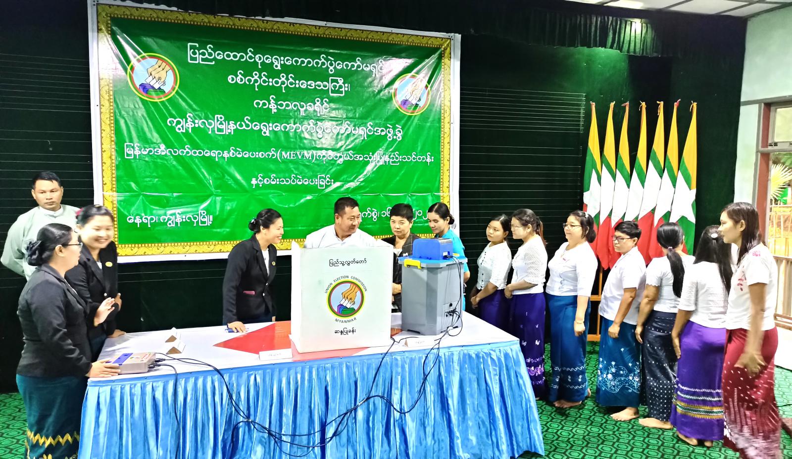 စစ်ကိုင်းတိုင်းဒေသကြီး၊ ကန့်ဘလူခရိုင်၊ ကျွန်းလှမြို့နယ် ရွေးကောက်ပွဲကော်မရှင်အဖွဲ့ခွဲမှ မြန်မာအီလက်ထရောနစ် မဲပေးစက်ဖြင့် (MEVM) ကိုင်တွယ်အသုံးပြုနည်းနှင့် စမ်းသတ်မဲပေးခြင်းကို ယနေ့နံနက် ၉ နာရီက မြို့နယ်စုပေါင်းရုံးခန်းမ၌ ကျင်းပသည်။