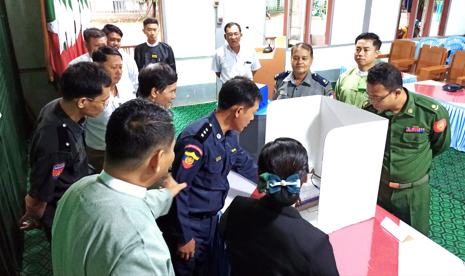 ထို့နောက် မြို့နယ်စီမံအုပ်ချုပ်ရေးအဖွဲ့ ခေတ္တဥက္ကဋ္ဌနှင့် အဖွဲ့ဝင်များ၊ မြို့နယ်အထွေထွေအုပ်ချုပ်ရေးဦးစီးဌာန၊ ခေတ္တအုပ်ချုပ်ရေးမှူးနှင့် စာရေးဝန်ထမ်းများ၊ မြို့နယ်အဆင့်ဌာနဆိုင်ရာများ၊ ရပ်ကွက်/ ကျေးရွာအုပ်စု အုပ်ချုပ်ရေးမှူးများနှင့် တာဝန်ရှိသူများက မြန်မာအီလက်ထရောနစ် မဲပေးစက်ဖြင့် လက်တွေ့စမ်းသပ်မဲပေးကြကြောင်း သိရသည်။