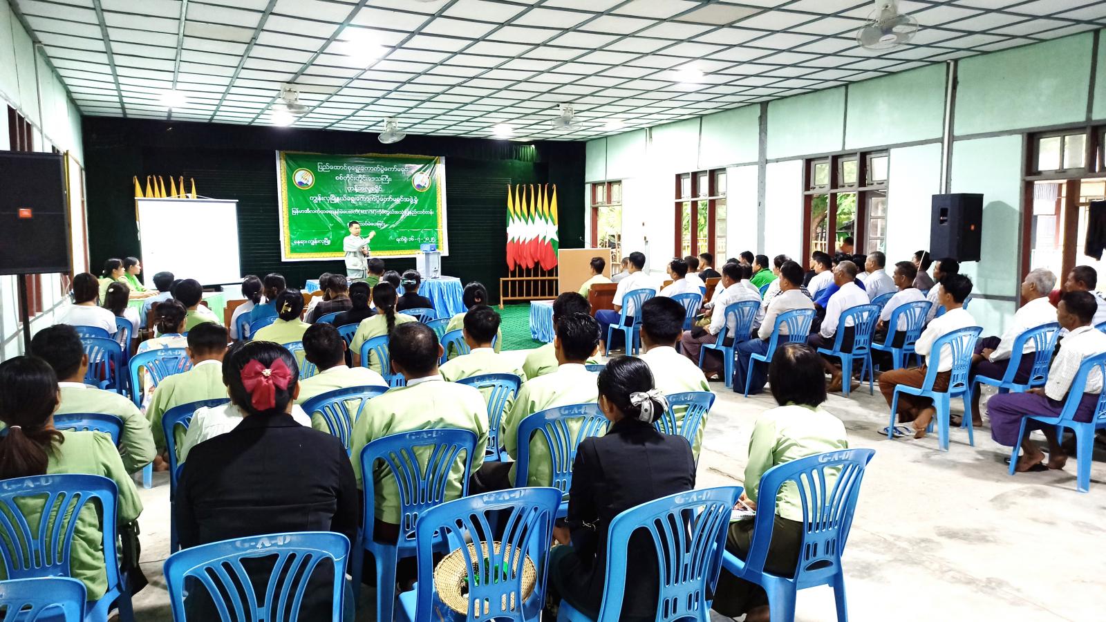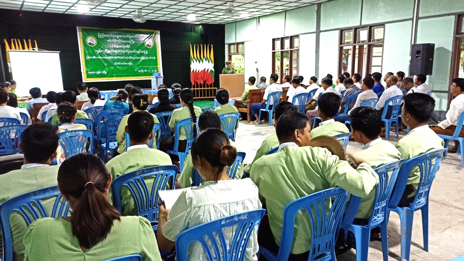 ဦးစွာ မြို့နယ်စီမံအုပ်ချုပ်ရေးအဖွဲ့ခေတ္တဥက္ကဋ္ဌ ဗိုလ်မှူးဖြိုးသန့်ဇင်ထွန်းက အမှာစကားပြောကြားပြီး ခရိုင်ရွေးကောက်ပွဲအရာရှိ ဦးရဲမင်းသော်က မဲပေးစက်ဖြင့် မဲပေးခြင်းလုပ်ငန်းအဆင့်ဆင့်၊ အကျိုးကျေးဇူးနှင့် လုံခြုံစိတ်ရခြင်းအကြောင်းတို့ကို ပရိုဂျက်တာဖြင့် ရှင်းလင်းသည်။