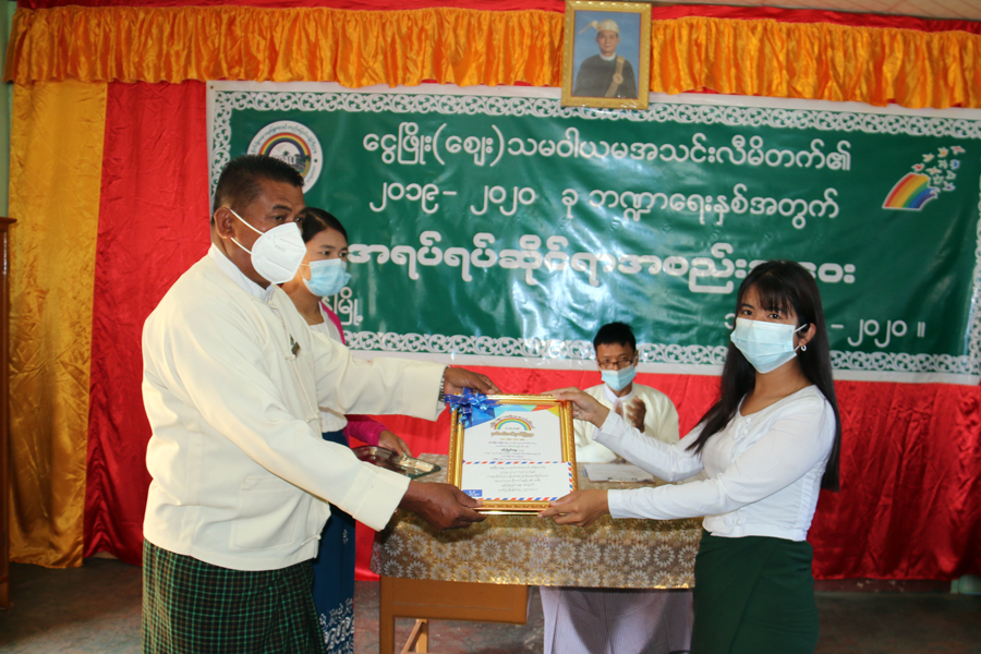 ဆက်လက်၍ မြို့နယ်သမဝါယမ ဦးစီးဌာနမှ ဦးစီးအရာရှိဦးတင်ထွန်းက ၂၀၁၈-၂၀၁၉ ပညာ သင်နှစ်တွင် တက္ကသိုလ် ဝင်တန်းစာမေးပွဲ အောင်မြင်ခဲ့သော အသင်းသား/သူများ၏ သားသမီး ၅ ဘာသာဂုဏ်ထူးရှင် (၁)ဦး ၊ ၁ဘာသာဂုဏ်ထူးရှင် (၁) ဦးနှင့် ရိုးရိုးအောင်မြင်သူ (၂)ဦး စုစု ပေါင်း၄ ဦးကို ရိုးရိုးအောင် (၂၅၀၀၀ ကျပ်) ၊ ဂုဏ်ထူး ၁ ဘာသာ (၅၀၀၀ ကျပ်)နှုန်းဖြင့် စုစုပေါင်း ဂုဏ်ပြုငွေ (၁၃၀၀၀၀) ကျပ် နှင့် ဂုဏ်ပြုမှတ်တမ်း လွှာများကို ပေးအပ်ချီးမြှင့်ခဲ့သည်။