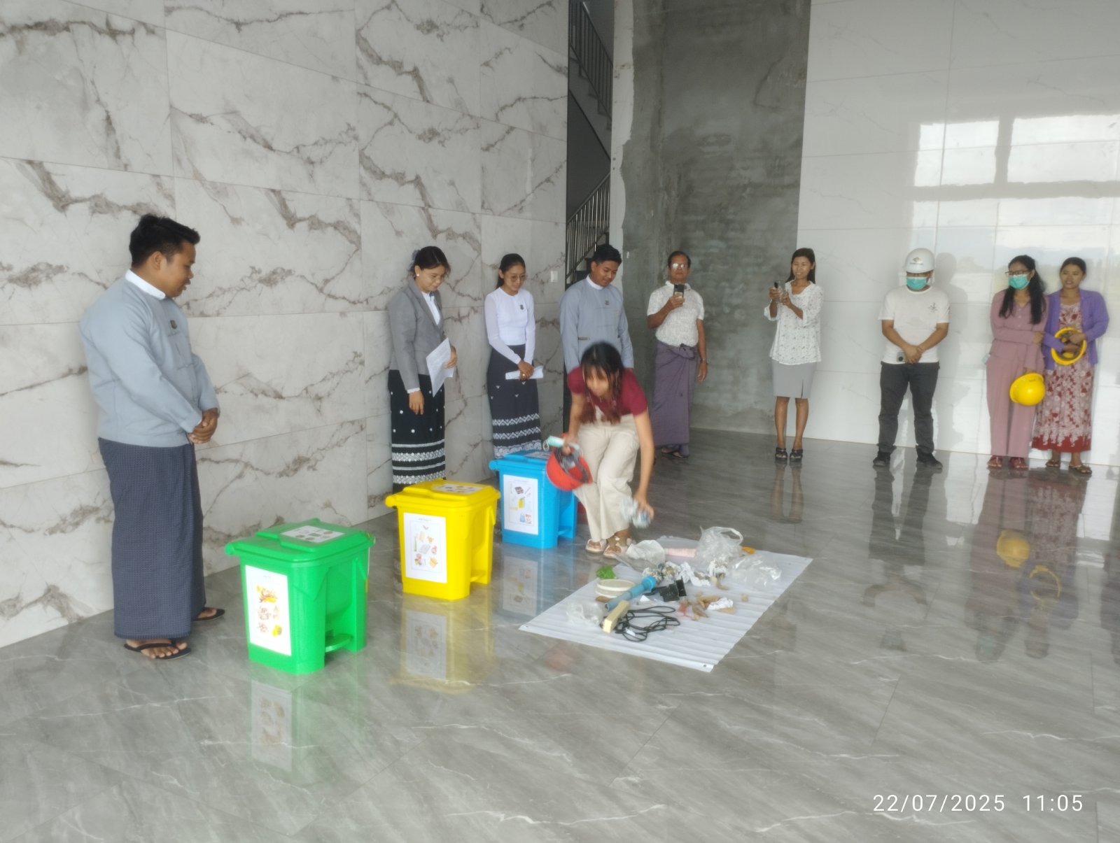 သရုပ်ပြခြင်းအခမ်းအနားတွင် ကျောက်ဆည်ခရိုင် ပတ်ဝန်းကျင်ထိန်းသိမ်းဦးစီးဌာမှ ဦးစီးအရာရှိ ဒေါ်ခင်စိုးစံနှင့်ဝန်ထမ်းများက စဉ့်ကိုင်မြို့နယ်၊ မီးသွေးဘုတ်ကျေးရွာရှိ Myanmar Mandalay Fuxin Steel Co.,Ltdမှ ဝန်ထမ်းများအား အမှိုက်ခွဲခြားစွန့်ပစ်ရန် အရောင်ခွဲခြား၍သတ်မှတ်ထားသည့် အမှိုက်ပုံးအမျိုး အစားများ၊ ခွဲခြားစွန့်ပစ်ရမည့် အမှိုက်အမျိုးအစားများနှင့်ပတ်သက်၍ သရုပ်ပြသခဲ့ရာ ဝန်ထမ်းများမှ အမှိုက်ခွဲခြားစွန့်ပစ်မှုများတွင် လက်တွေ့ပါဝင် ဆောင်ရွက်ခဲ့ကြောင်း သိရသည်။