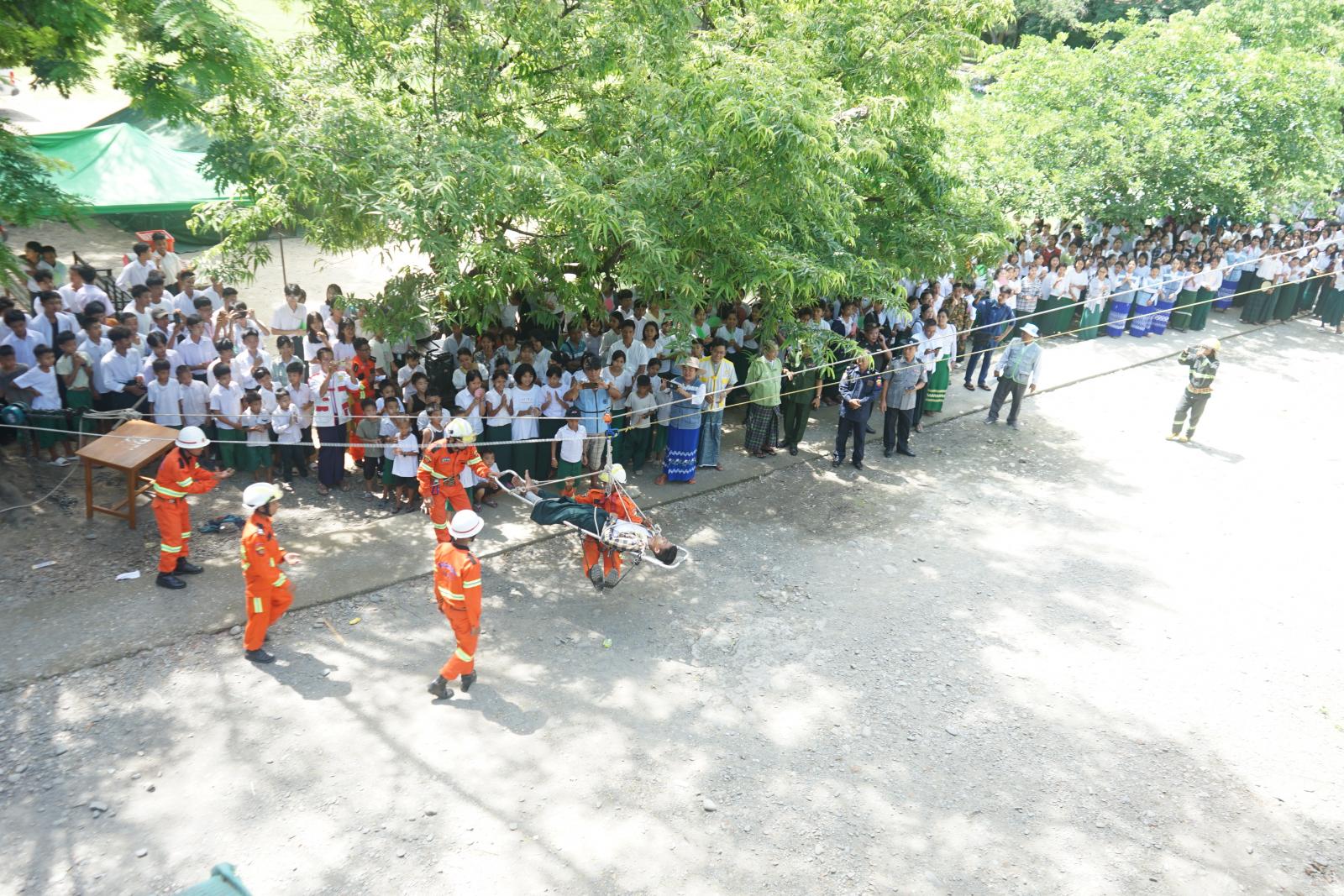 ထို့နောက်မီးသတ်တပ်ဖွဲ့ဝင်များမှကယ်ဆယ်ရေးဆိုင်ရာလုပ်ငန်းများတွင် အသုံးပြုသည့် စက်ပစ္စည်းများဖြင့် ကယ်ဆယ်ရေးလုပ်ငန်းဆောင်ရွက်မှုများ၊ ယာယီတဲများတွင် ကျန်းမာရေး စောင့်ရှောက်မှုပေးခြင်းများကို လက်တွေ့သဏ္ဌာန်သရုပ်ပြသခဲ့ကြသည်။ အဆိုပါအခမ်းအနားသို့ ခရိုင်စီမံအုပ်ချုပ်ရေးအဖွဲ့ဥက္ကဋ္ဌနှင့်အဖွဲ့ဝင်များ၊ မြို့နယ်စီမံအုပ်ချုပ်ရေးအဖွဲ့ဥက္ကဋ္ဌနှင့် အဖွဲ့ဝင်များ၊ မြို့မိမြို့ဖများ၊ ဌာနဆိုင်ရာတာဝန်ရှိသူများ၊ ကြက်ခြေနီတပ်ဖွဲ့များ၊ အ.ထ.က(၃) ကျောင်းမှ ဆရာ၊ ဆရာမများ၊ ကျောင်းသား၊ ကျောင်းသူများ တက်ရောက်ခဲ့ကြောင်း သိရသည်။