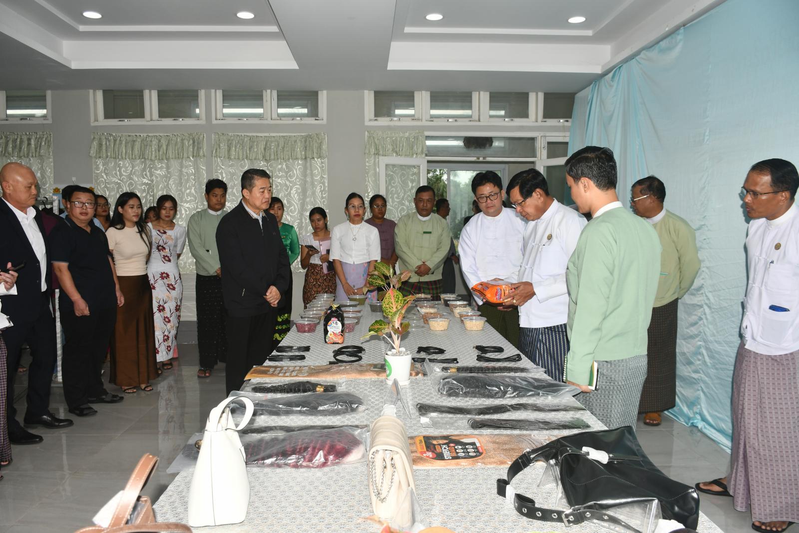 ဦးစွာ ရန်ကုန်တိုင်းဒေသကြီးအစိုးရအဖွဲ့ဝန်ကြီးချုပ် ဦးစိုးသိန်းနှင့်အဖွဲ့သည် ရင်းနှီးမြှုပ်နှံသူ လုပ်ငန်းရှင်များ၏ ထုတ်လုပ်သည့်ပစ္စည်းနမူနာပြသထားရှိမှုများကို ကြည့်ရှုစစ်ဆေးကြသည်။