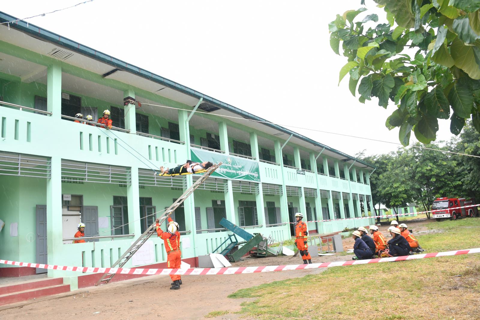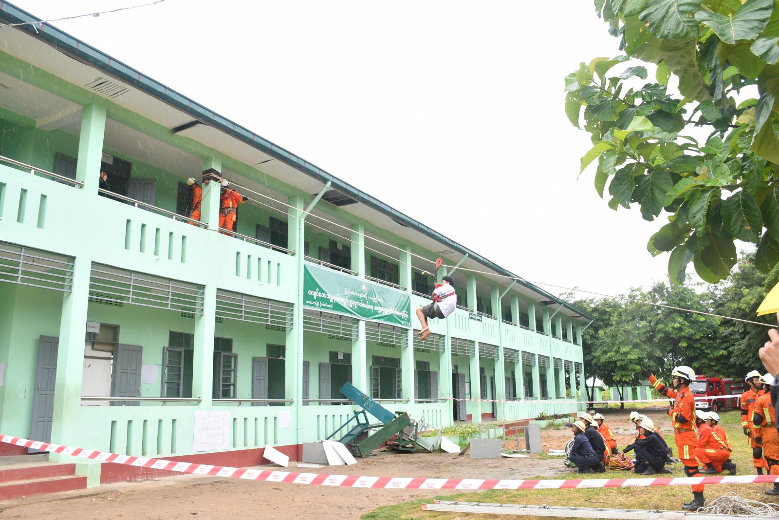 ယင်းနောက် နေပြည်တော်ကောင်စီဝင် ဦးဇေယျာလင်းနှင့်တာဝန်ရှိသူများ ဗိုလ်မင်းရောင်ရပ်ကွက်၊ အခြေခံပညာအထက်တန်းကျောင်း(ခွဲ)တွင် မြို့နယ်မီးသတ်ဦးစီးဌာနမှ ငလျင်ဘေးအန္တရာယ် ရှာဖွေကယ်ဆယ်ရေးသဏ္ဍာန်တူ ဇာတ်တိုက်လေ့ကျင့်ရေးအခမ်းအနားသို့ ရောက်ရှိ၍ မြို့နယ်မီးသတ်ဦးစီးဌာနမှ ဦးစီးအရာရှိ ဦးဟိန်းအောင်ကျော်ကြီးကြပ်၍ ဒုမီးသတ်ဦးစီးမှူး ဦးသော်ခန့်ဝေ ဦးဆောင်၍ မီးသတ်ဝန်ထမ်းများ၊ ပရဟိတအဖွဲ့ဝင်များ၊ ကြက်ခြေနီတပ်ဖွဲ့ဝင်များနှင့်အတူ အထပ်မြင့်မှ လူနာကယ်ဆယ်နည်း၊ အထပ်မြင့်မှ လူနာအား Ladder Crane Method အသုံးပြုကယ်ဆယ်နည်း၊ အဆောက်အဦ ပိတ်မိလူနာအား နံရံဖောက်ထွင်းကယ်ဆယ်နည်း၊ အဆောက်အဦပိတ်မိလူနာအား Hydraulic power unit နှင့် hydraulic ram ၊ hydraulic spreader ၊ hydraulic cutter ၊ lifting bag ၊ Engine Cutter အသုံးပြု၍ ကယ်ဆယ်နည်း၊ ခြေထောက်ပိမိလူနာအား သံတူရွင်းအသုံးပြု၍ Coke Lever ကယ်ဆယ်နည်းဇာတ်တိုက်လေ့ကျင့်မှုများ၊ သဘာဝဘေးအန္တရာယ်လျော့ချရေးနှင့် တုန့်ပြန်ဆောင်ရွက်ရေးအသိပညာပေး ကစာနည်း(Kaeru Caravan)များ ဆောင်ရွက်ပေးမှုအားကြည့်ရှုအားပေးခဲ့ပြီး လိုအပ်သည်များလမ်းညွှန်မှာကြားခဲ့ပြီးနောက် ဇာတ်တိုက်လေ့ကျင့်မှုပါဝင်ဆောင်ရွက်ကြသည့် ကျောင်းသား၊ ကျောင်းသူများအား မုန့်များဝေငှပေးခဲ့သည်။