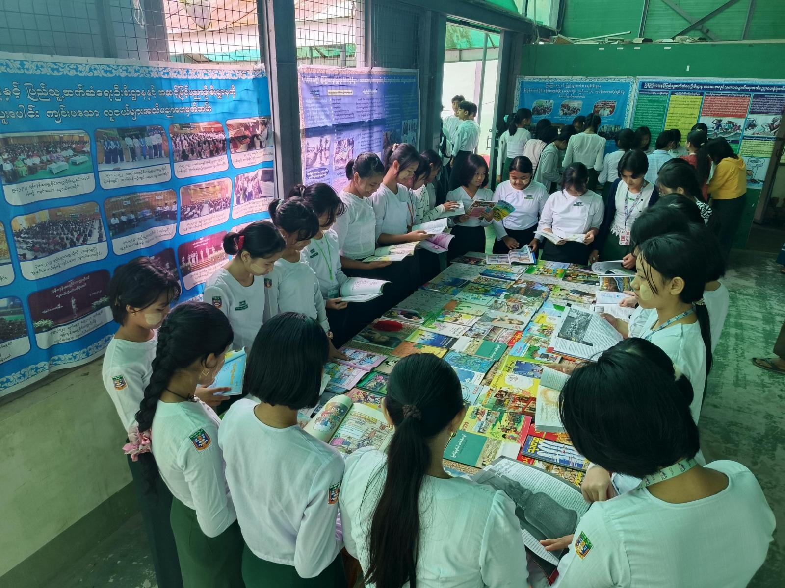 ယနေ့အခမ်းအနားသို့ ကျောင်းသား၊ ကျောင်းသူ (၈၂၀) ဦး တက်ရောက်ကြပြီး ပြန်ကြားရေးနှင့်ပြည်သူ့ဆက်ဆံရေးဦးစီးဌာနမှ ခင်းကျင်းပြသထားသော ဓာတ်ပုံ၊နံရံကပ်စာစောင်၊ စာအုပ်ပြပွဲများ ခင်းကျင်းပြသထားရာ ကျောင်းသား၊ ကျောင်းသူလေးများက စိတ်ပါဝင်စားစွာ ကြည့်ရှုလေ့လာကြကြောင်း သိရသည်။