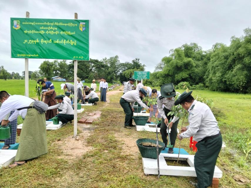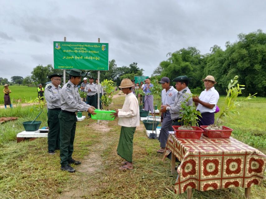 ဦးစွာ မြို့အုပ်ချုပ်ရေးမှူး ဦးသန့်ဇင်၊ မြို့နယ်သစ်တောဦးစီးဌာန ဦးစီးအရာရှိဦးသန်းစိုးနိုင်နှင့်တာဝန်ရှိသူများက စိုက်ပျိုးမည့်ပျိုးပင်များအား ကျေးရွာအုပ်ချုပ်ရေးမှူးများနှင့် ကျေးရွာပြည်သူများထံ ပေးအပ်သည်။