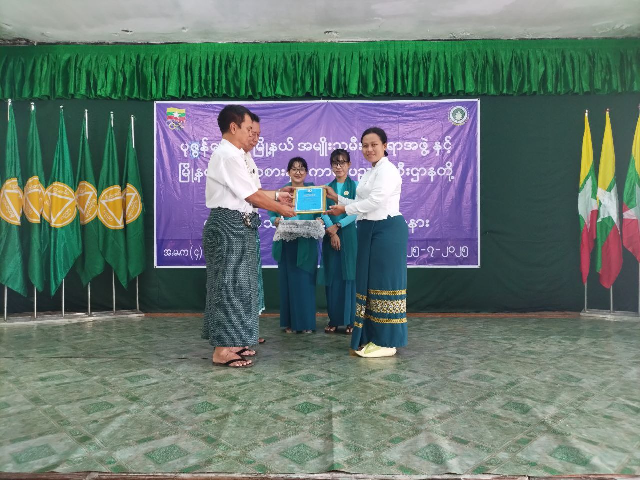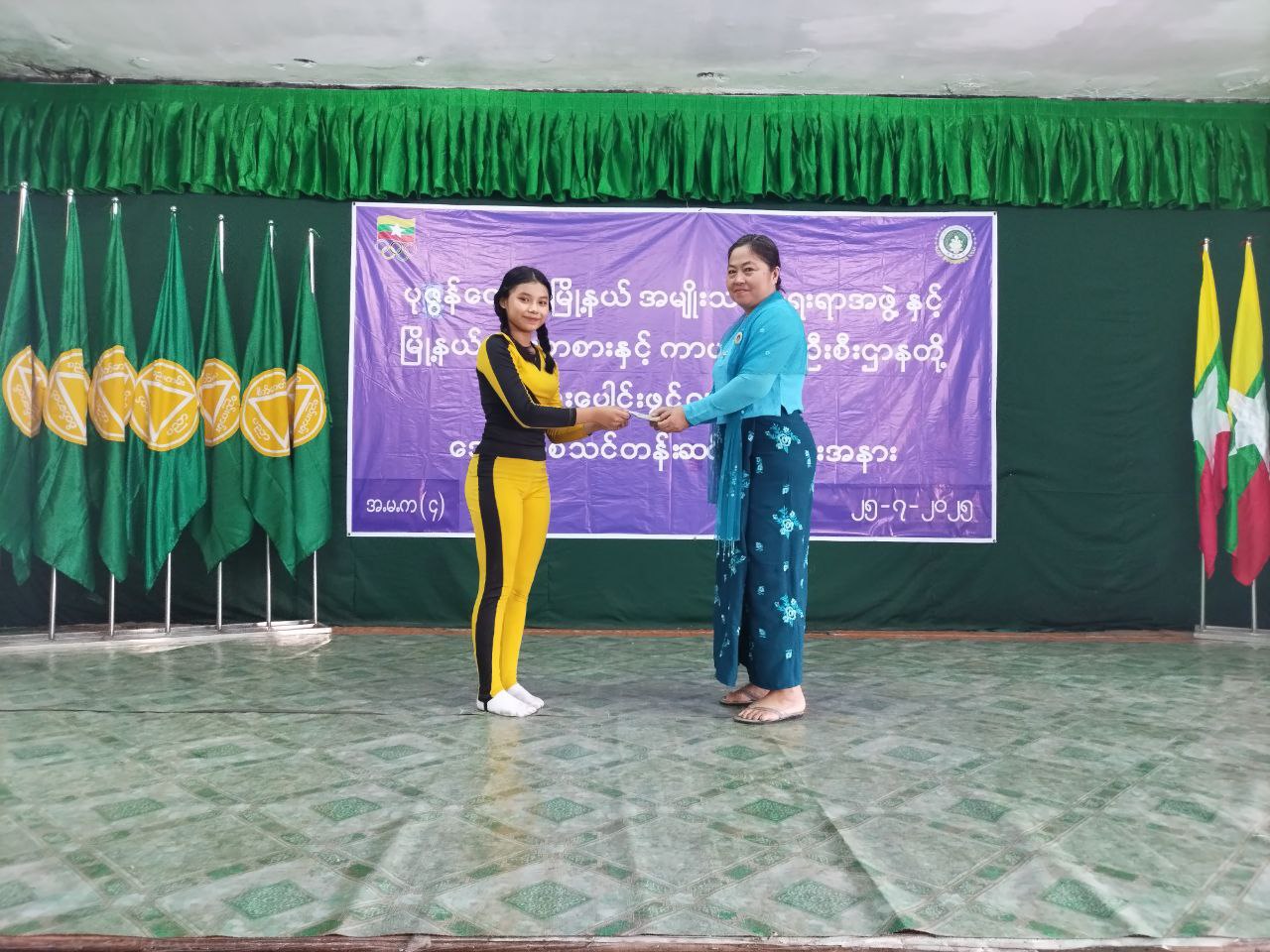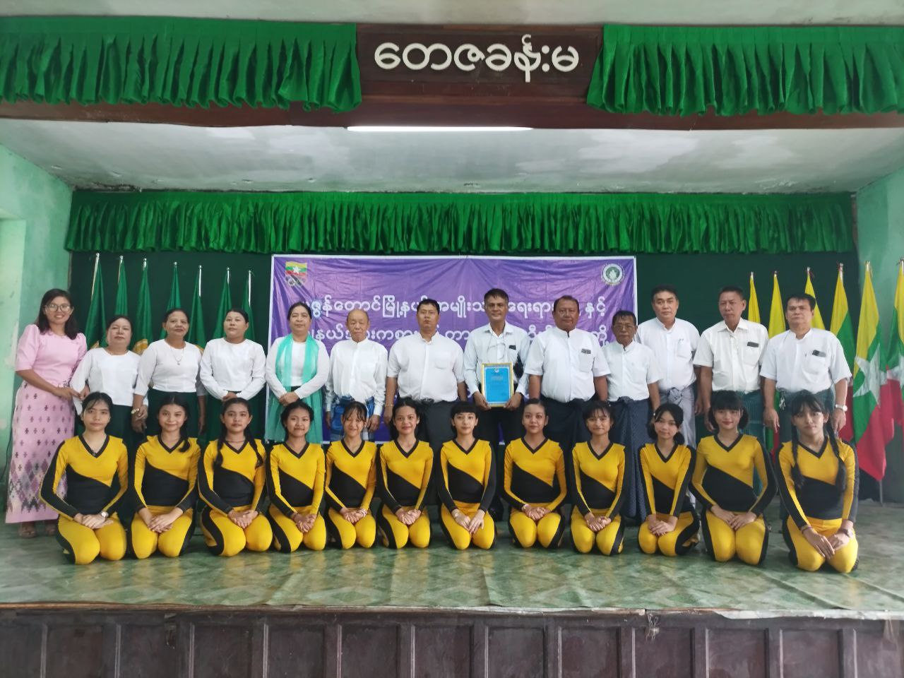 အခမ်းအနားတွင် မြို့နယ်စီမံအုပ်ချုပ်ရေးအဖွဲ့ဥက္ကဋ္ဌ ဦးဇော်မိုးအောင်က သင်တန်းဆင်း အမှာစကားပြောကြားပြီး သင်တန်းသူများက အေရိုးဗစ်အားကစားနည်းဖြင့် သရုပ်ပြသဖျော်ဖြေခဲ့ရာ အခမ်းအနားတက်ရောက်လာသူများမှ သင်တန်းသူများကို ဂုဏ်ပြုဆုငွေများ ပေးအပ်ခဲ့သည်။ ဆက်လက်ပြီး မြို့နယ်စီမံအုပ်ချုပ်ရေးအဖွဲ့၊ မြို့နယ်အမျိုးသမီးရေးရာအဖွဲ့ဥက္ကဋ္ဌ ဒေါ်နှင်းနှင်းအေးနှင့် တာဝန်ရှိသူများမှ သင်တန်းနည်းပြနှင့်သင်တန်းအတွက် ထောက်ပံ့ပေးသည့် အလှူရှင်များအား ဂုဏ်ပြုမှတ်တမ်း များပေးအပ်ခဲ့ကြပြီး စုပေါင်းမှတ်တမ်းတင်ဓာတ်ပုံ ရိုက်ကူးခဲ့ကြသည်။