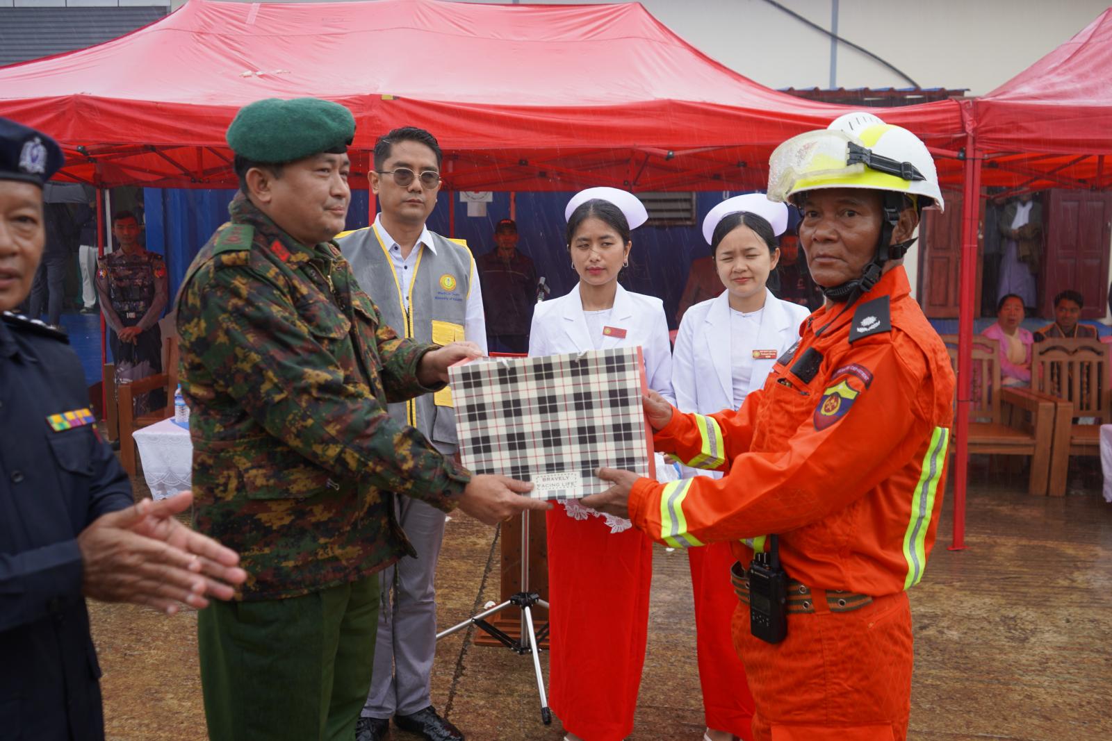ဦးစွာ သရုပ်ပြအဖွဲ့က ငလျင်လှုပ်မှုကြောင့် အထပ်မြင့်အဆောက်အဦပြိုကျပြီး အသက်ရှင်လျက်ရှိသည့် လူနာအား ရှာဖွေကယ်ဆယ်ခြင်းနှင့် လူနာအား သက်ဆိုင်ရာဆေးရုံသို့ အရေးပေါ် ပို့ဆောင်နိုင်ရေးဆောင်ရွက်မှု၊ HNE ဟုခေါ်သည့် ခေတ်မီနည်းပညာဖြင့် ထုတ်လုပ်ထားသော ကျောလွယ်ရွှေ့လျားအမြှပ်မီးသတ်ဆေးဘူးဖြင့် ဆီမီးလောင်ရာတွင် ကိုင်တွယ်အသုံးပြုနည်း၊ ဂတ် ယိုစိမ့်မှုကြောင့် မတော်တဆမီးလောင်မှုများ ဖြစ်ပွားပါက မီးငြိမ်းသတ်နည်းများကို သရုပ်ပြကြသည်။