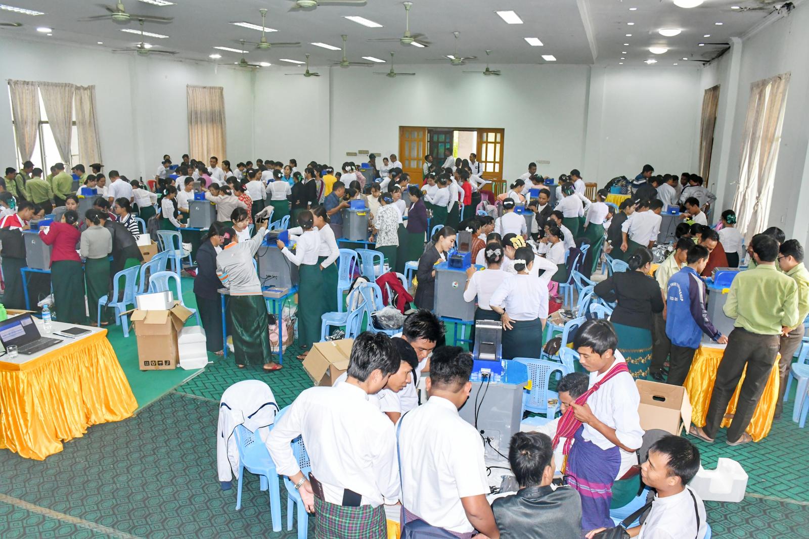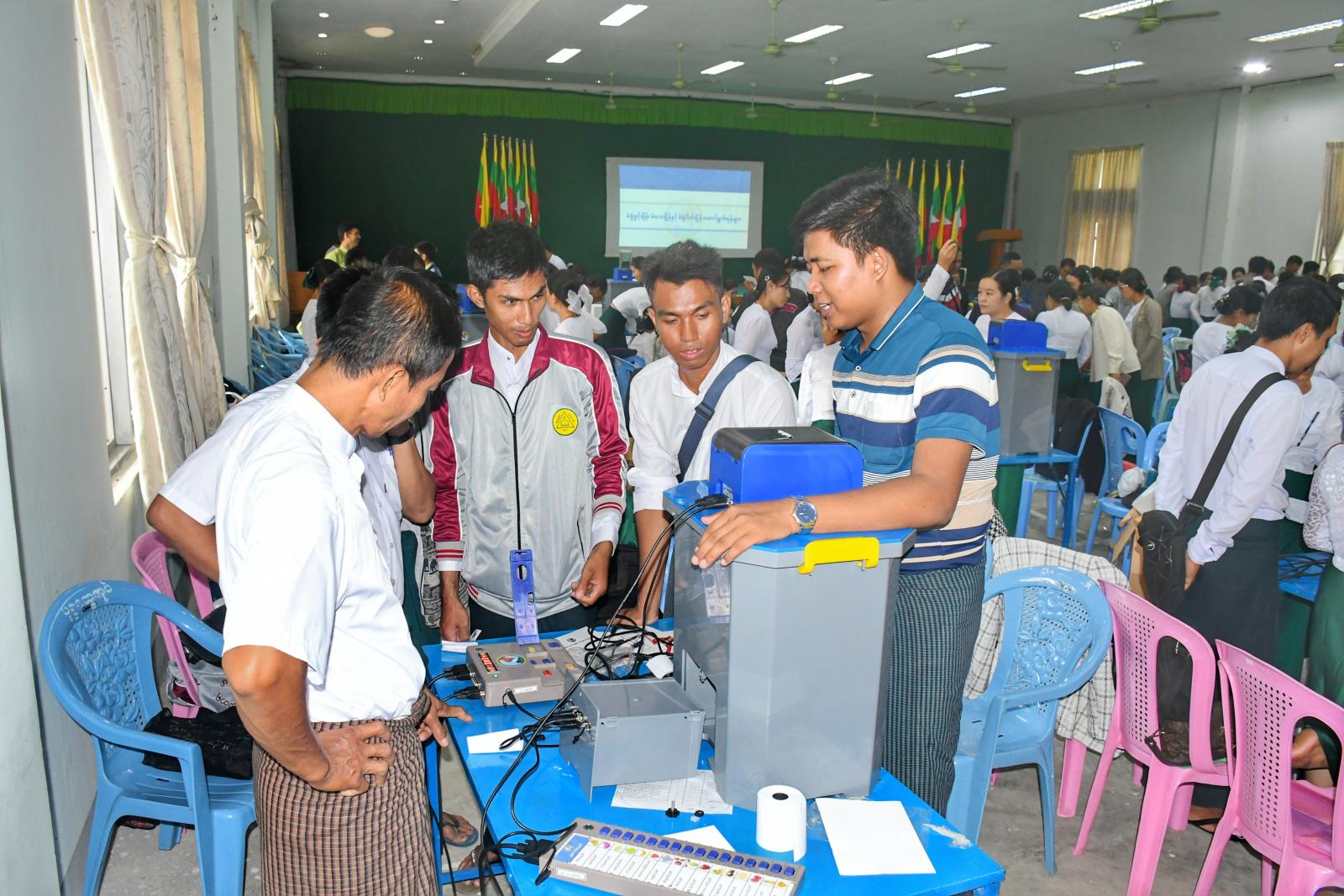 ပြည်ထောင်စုနယ်မြေ၊ နေပြည်တော် ပုဗ္ဗသီရိမြို့နယ်၊ ရွေးကောက်ပွဲကော်မရှင်အဖွဲ့ခွဲမှ ပြုလုပ်သော မြန်မာအီလက်ထရောနစ်စနစ်မဲပေးစက် (MEVM)တပ်ဆင်ကိုင်တွယ်အသုံးပြုခြင်းဆိုင်ရာ မြို့နယ်အဆင့်သင်တန်းဖွင့်ပွဲအခမ်းအနားကို ယနေ့နံနက်ပိုင်းက မြို့နယ်အထွေထွေအုပ်ချုပ်ရေးဦးစီးဌာနရုံး အစည်းအဝေးခန်းမ၌ ပြုလုပ်သည်။