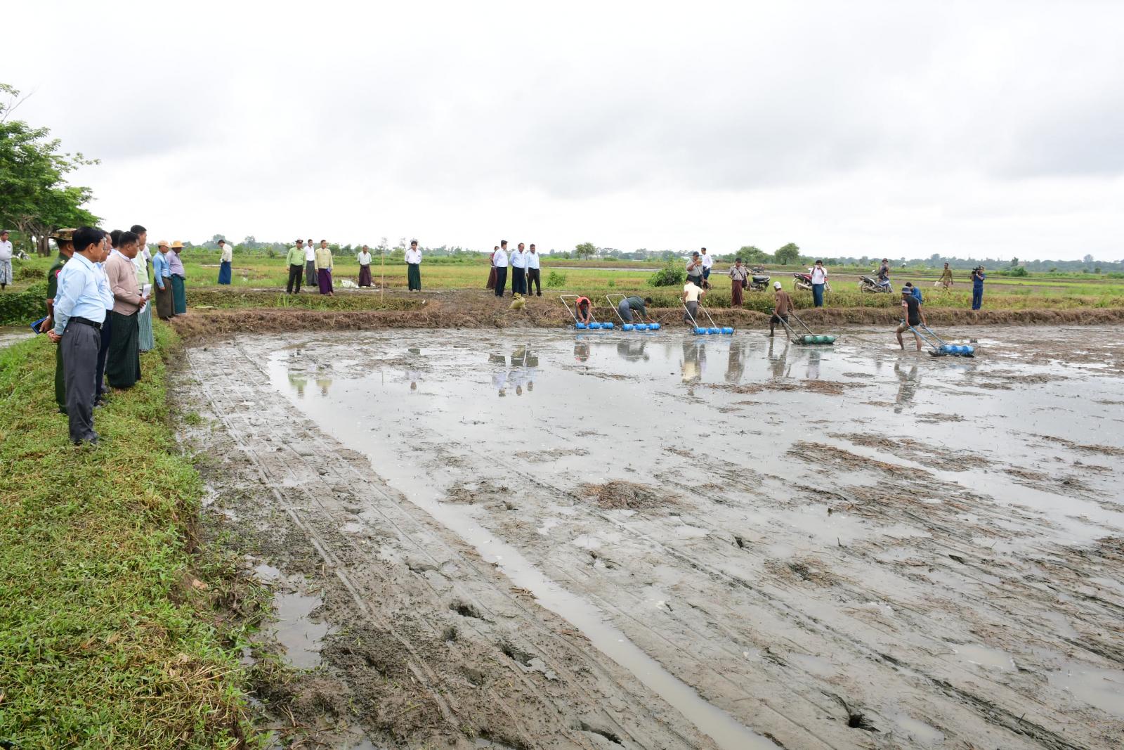 ထို့နောက် လက်ဆွဲမျိုးစေ့ချကိရိယာနှင့် မျိုးစေ့ချစက်များဖြင့် မိုးစပါးစိုက်ပျိုးနေမှုအား ကြည့်ရှုအားပေးကြပြီး နေပြည်တော်ကောင်စီဥက္ကဋ္ဌနှင့် တာဝန်ရှိသူများက မျိုးစေ့ချကိရိယာများဖြင့် စိုက်ပျိုးရခြင်းနှင့်ပတ်သက်၍ တောင်သူများအား အသိပညာပေး ပြောကြားခဲ့ကြောင်း သိရသည်။